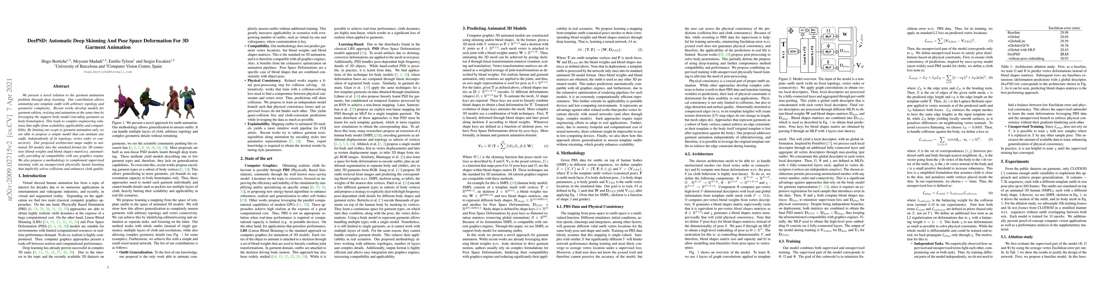 DeePSD introduces a deep learning method for automatic garment animation, enabling any outfit to be animated regardless of its complexity. It simplifies the animation process by mapping outfits to standard 3D animation formats, ensuring compatibility with any graphics engine, and employs a combination of supervised and unsupervised learning to improve cloth quality.