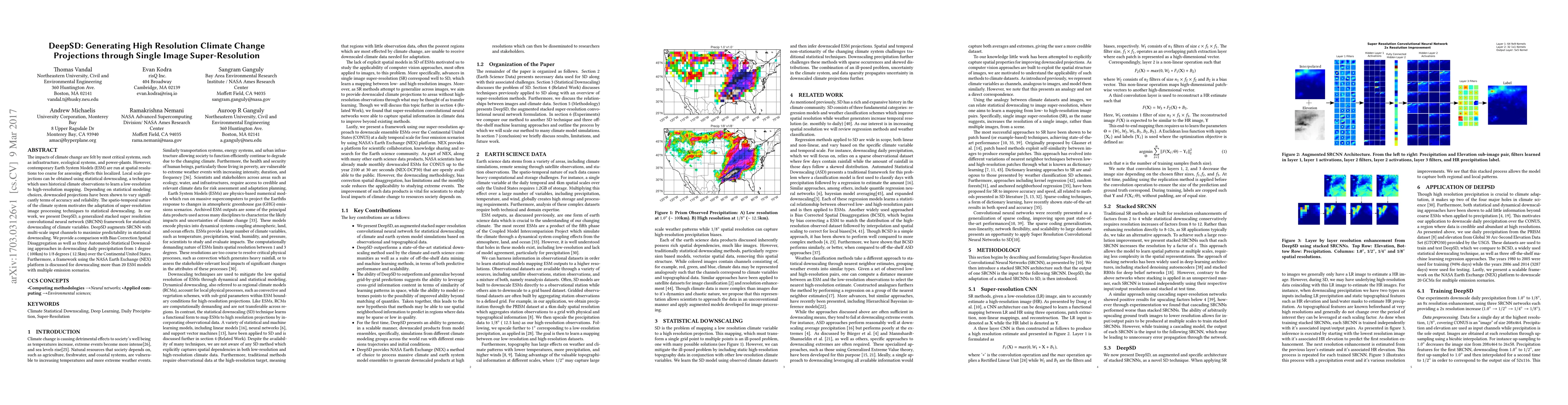 DeepSD employs a stacked super-resolution convolutional neural network to enhance the resolution of climate change projections, improving localized assessments. The framework is compared against traditional statistical methods, demonstrating superior performance in downscaling daily precipitation over the Continental United States.