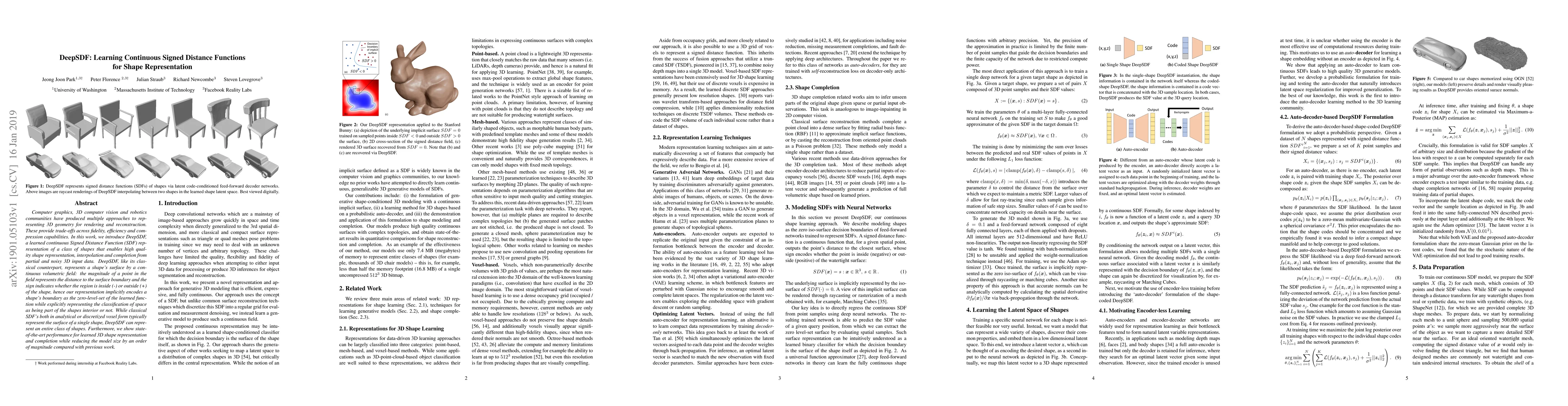 DeepSDF introduces a learned continuous Signed Distance Function (SDF) representation for a class of 3D shapes, enabling high-quality shape interpolation and completion from noisy data. It achieves state-of-the-art performance and reduces model size significantly compared to previous methods.