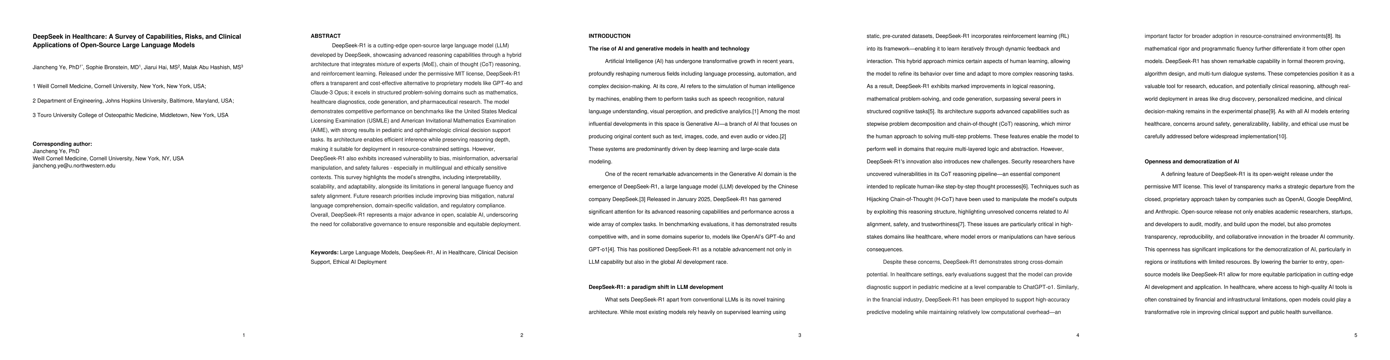 The paper provides a comprehensive survey of DeepSeek-R1, an open-source large language model, focusing on its capabilities, risks, and clinical applications.