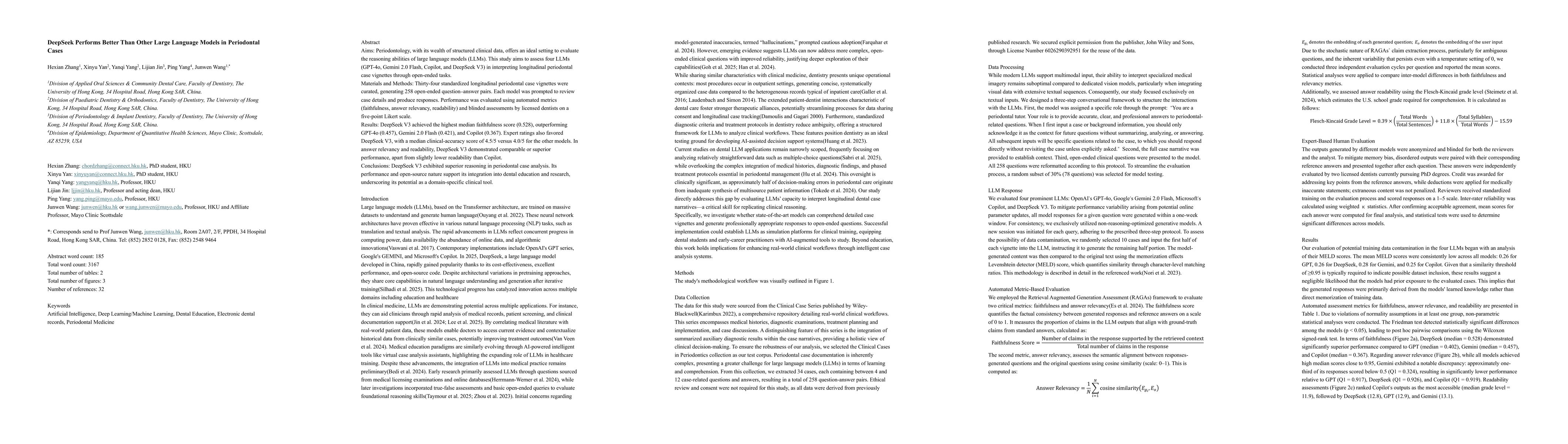 Large language models (LLMs) hold transformative potential in healthcare, yet their capacity to interpret longitudinal patient narratives remains inadequately explored. Dentistry, with its rich repository of structured clinical data, presents a unique opportunity to rigorously assess LLMs' reasoning abilities. While several commercial LLMs already exist, DeepSeek, a model that gained significant attention earlier this year, has also joined the competition. This study evaluated four state-of-the-art LLMs (GPT-4o, Gemini 2.0 Flash, Copilot, and DeepSeek V3) on their ability to analyze longitudinal dental case vignettes through open-ended clinical tasks. Using 34 standardized longitudinal periodontal cases (comprising 258 question-answer pairs), we assessed model performance via automated metrics and blinded evaluations by licensed dentists. DeepSeek emerged as the top performer, demonstrating superior faithfulness (median score = 0.528 vs. 0.367-0.457) and higher expert ratings (median = 4.5/5 vs. 4.0/5), without significantly compromising readability. Our study positions DeepSeek as the leading LLM for case analysis, endorses its integration as an adjunct tool in both medical education and research, and highlights its potential as a domain-specific agent.