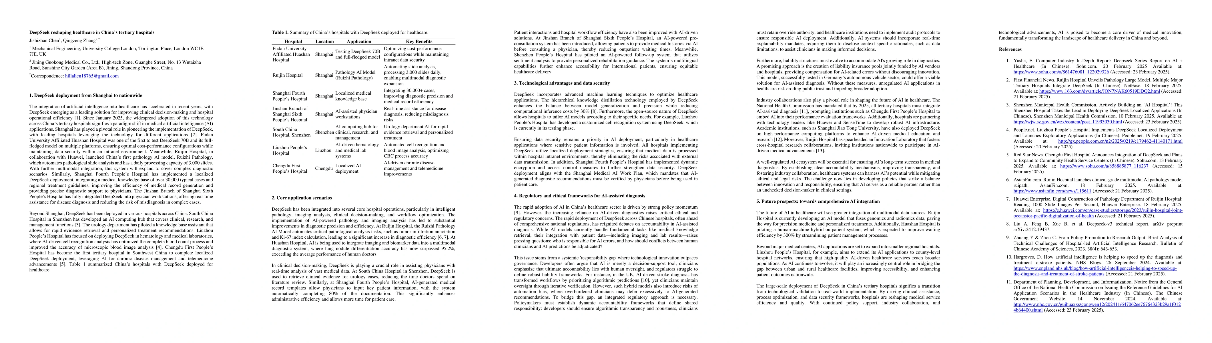 The rapid integration of artificial intelligence (AI) into healthcare is transforming clinical decision-making and hospital operations. DeepSeek has emerged as a leading AI system, widely deployed across China's tertiary hospitals since January 2025. Initially implemented in Shanghai's major medical institutions, it has since expanded nationwide, enhancing diagnostic accuracy, streamlining workflows, and improving patient management. AI-powered pathology, imaging analysis, and clinical decision support systems have demonstrated significant potential in optimizing medical processes and reducing the cognitive burden on healthcare professionals. However, the widespread adoption of AI in healthcare raises critical regulatory and ethical challenges, particularly regarding accountability in AI-assisted diagnosis and the risk of automation bias. The absence of a well-defined liability framework underscores the need for policies that ensure AI functions as an assistive tool rather than an autonomous decision-maker. With continued technological advancements, AI is expected to integrate multimodal data sources, such as genomics and radiomics, paving the way for precision medicine and personalized treatment strategies. The future of AI in healthcare depends on the development of transparent regulatory structures, industry collaboration, and adaptive governance frameworks that balance innovation with responsibility, ensuring equitable and effective AI-driven medical services.