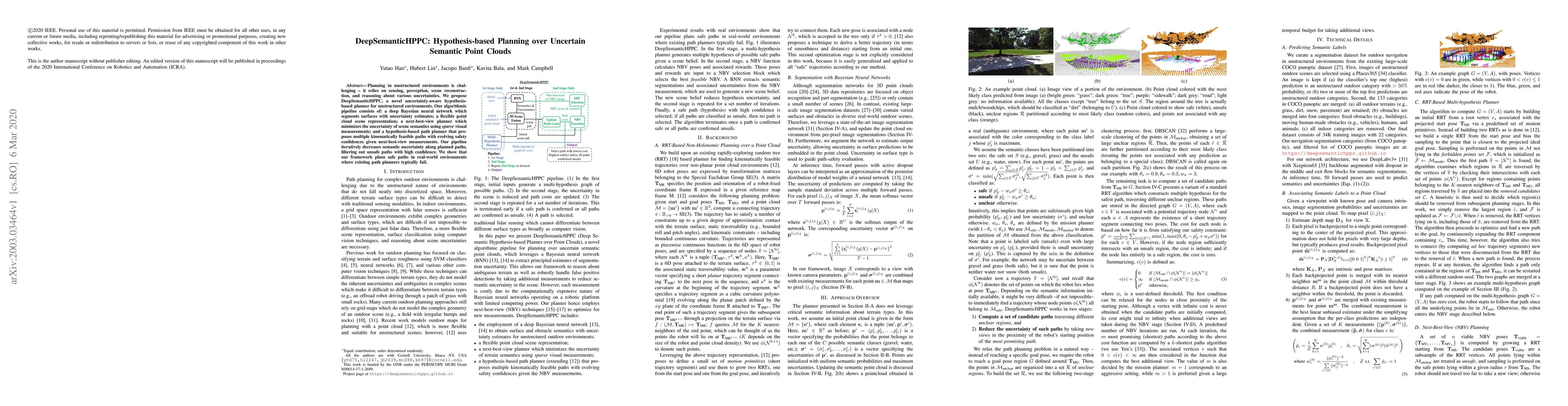 Planning in unstructured environments is challenging -- it relies on sensing, perception, scene reconstruction, and reasoning about various uncertainties. We propose DeepSemanticHPPC, a novel uncertainty-aware hypothesis-based planner for unstructured environments. Our algorithmic pipeline consists of: a deep Bayesian neural network which segments surfaces with uncertainty estimates; a flexible point cloud scene representation; a next-best-view planner which minimizes the uncertainty of scene semantics using sparse visual measurements; and a hypothesis-based path planner that proposes multiple kinematically feasible paths with evolving safety confidences given next-best-view measurements. Our pipeline iteratively decreases semantic uncertainty along planned paths, filtering out unsafe paths with high confidence. We show that our framework plans safe paths in real-world environments where existing path planners typically fail.