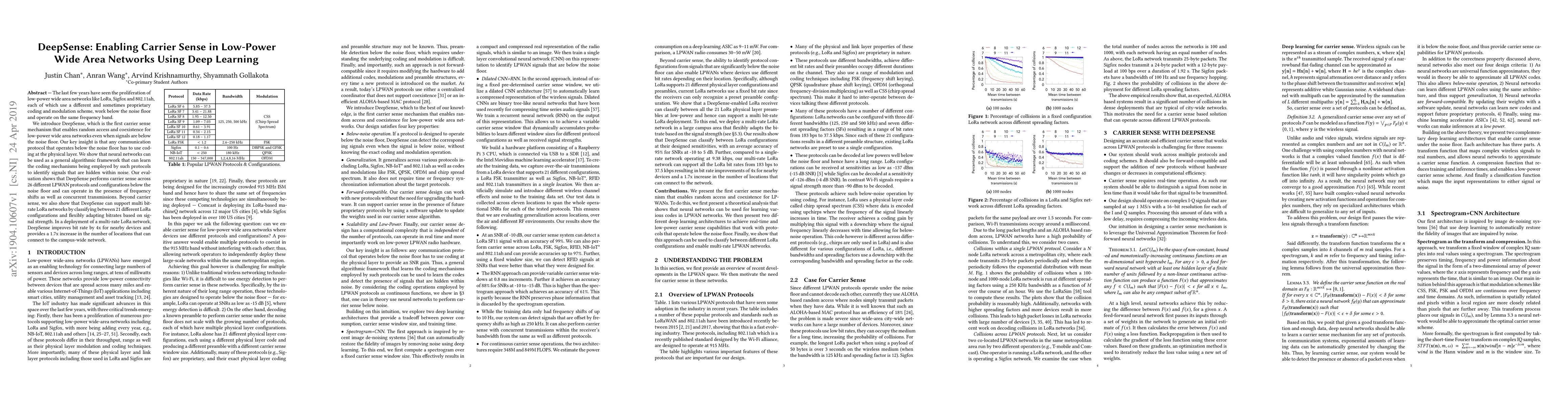 DeepSense introduces a novel carrier sense mechanism for low-power wide area networks (LPWAN) that identifies signals below the noise floor using deep learning. It enables coexistence and random access across 26 different LPWAN protocols, adapting bitrates dynamically to optimize network performance.
