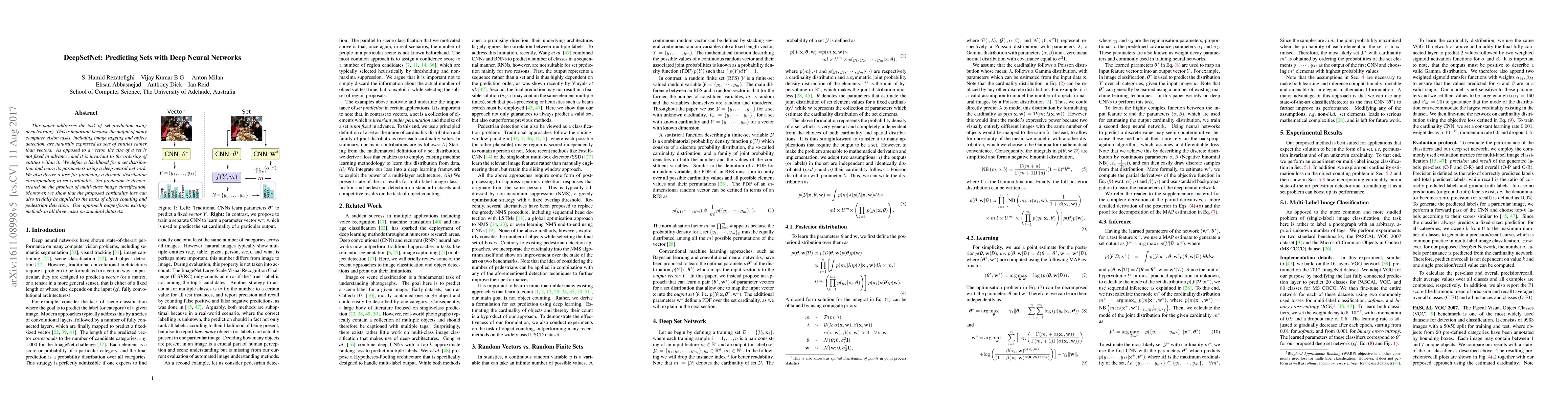 This paper addresses the task of set prediction using deep learning. This is important because the output of many computer vision tasks, including image tagging and object detection, are naturally expressed as sets of entities rather than vectors. As opposed to a vector, the size of a set is not fixed in advance, and it is invariant to the ordering of entities within it. We define a likelihood for a set distribution and learn its parameters using a deep neural network. We also derive a loss for predicting a discrete distribution corresponding to set cardinality. Set prediction is demonstrated on the problem of multi-class image classification. Moreover, we show that the proposed cardinality loss can also trivially be applied to the tasks of object counting and pedestrian detection. Our approach outperforms existing methods in all three cases on standard datasets.