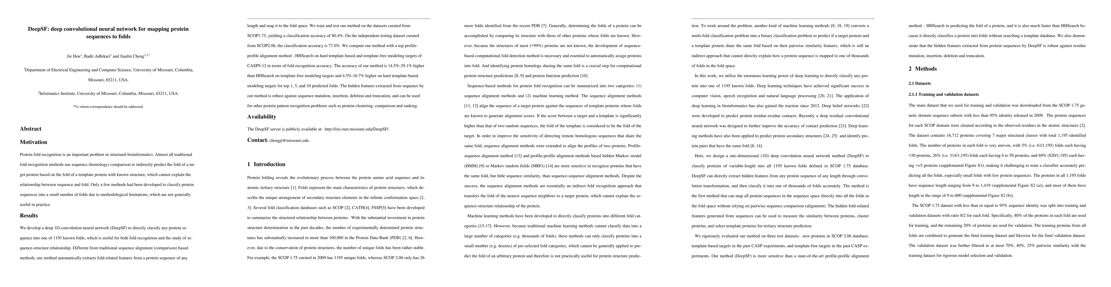 DeepSF employs a deep convolutional neural network to directly classify protein sequences into 1195 known folds, achieving higher accuracy than traditional sequence alignment methods, and demonstrating robustness against sequence mutations. This approach provides a novel method for fold recognition and sequence-structure relationship studies.