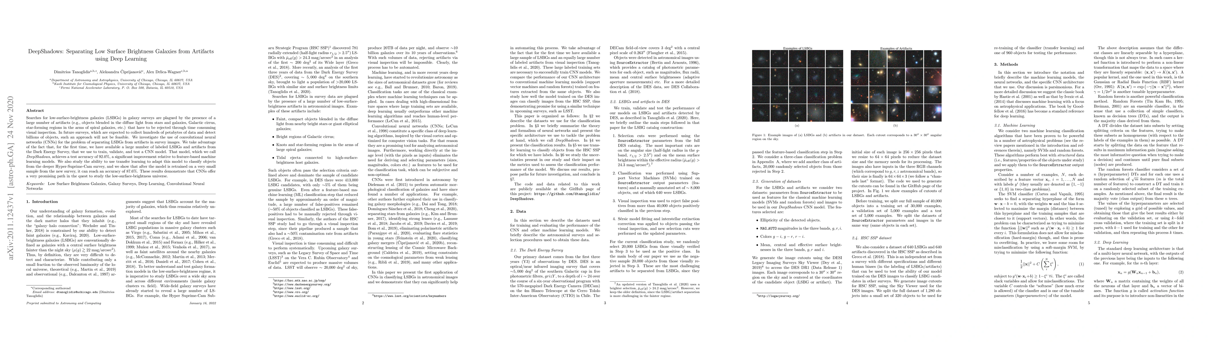 DeepShadows employs convolutional neural networks (CNNs) to accurately distinguish low-surface-brightness galaxies from survey artifacts, achieving 92.0% accuracy. The model also adapts to new surveys using transfer learning, maintaining 87.6% accuracy after retraining.