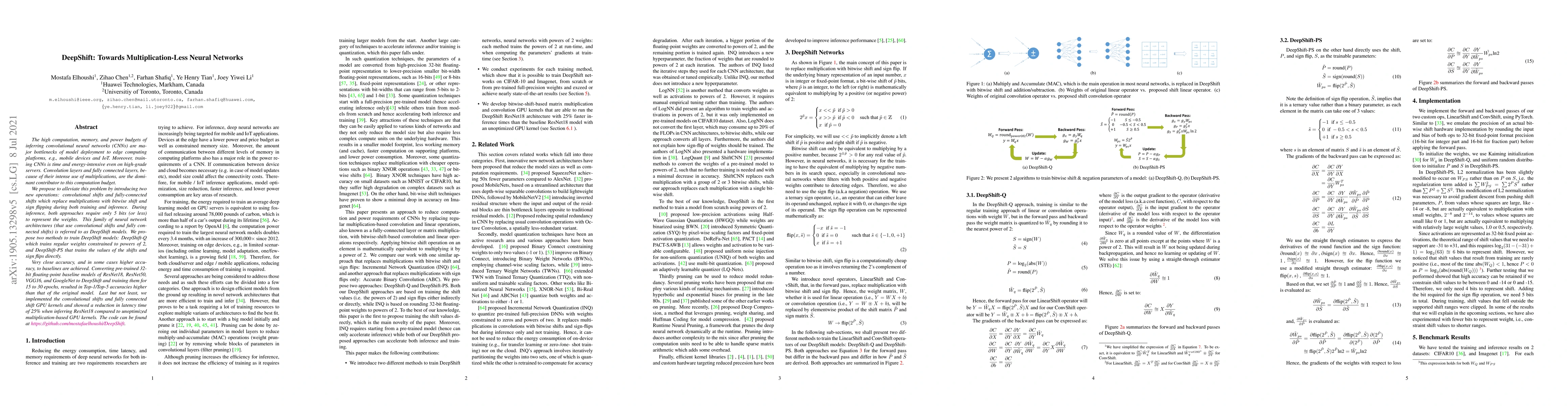 The paper proposes DeepShift, a novel neural network architecture that replaces multiplications in convolutional and fully connected layers with bitwise shift and sign flip operations to reduce computational and memory costs. This approach achieves close to baseline accuracy with significant reductions in latency and power consumption.