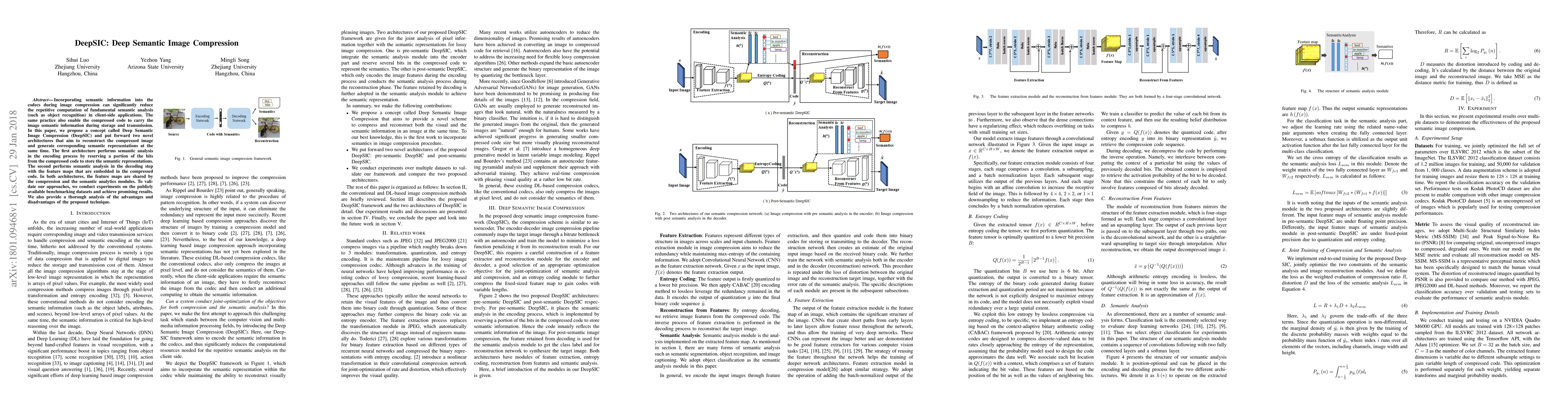 DeepSIC integrates semantic information into image compression to reduce client-side computation and enhance semantic representation during storage and transmission. The proposed architectures encode semantic analysis either during compression or decoding, sharing feature maps between compression and semantic modules, and show promising results on benchmark datasets.