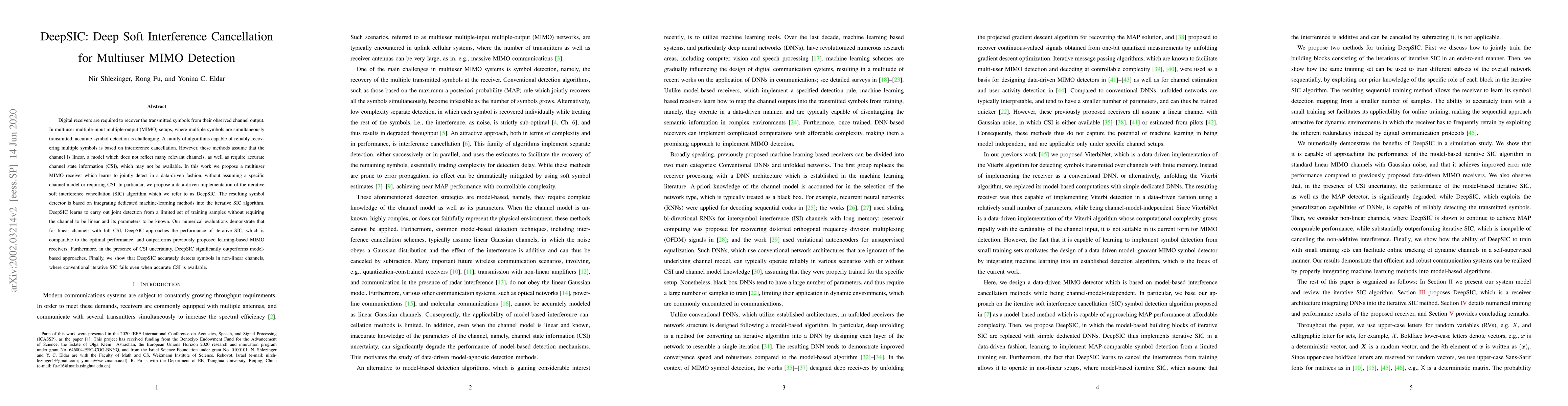 DeepSIC proposes a data-driven approach for multiuser MIMO symbol detection that integrates machine learning into iterative soft interference cancellation, achieving performance comparable to optimal methods and outperforming previous ML-based receivers, especially under channel state information uncertainty and non-linear channels.