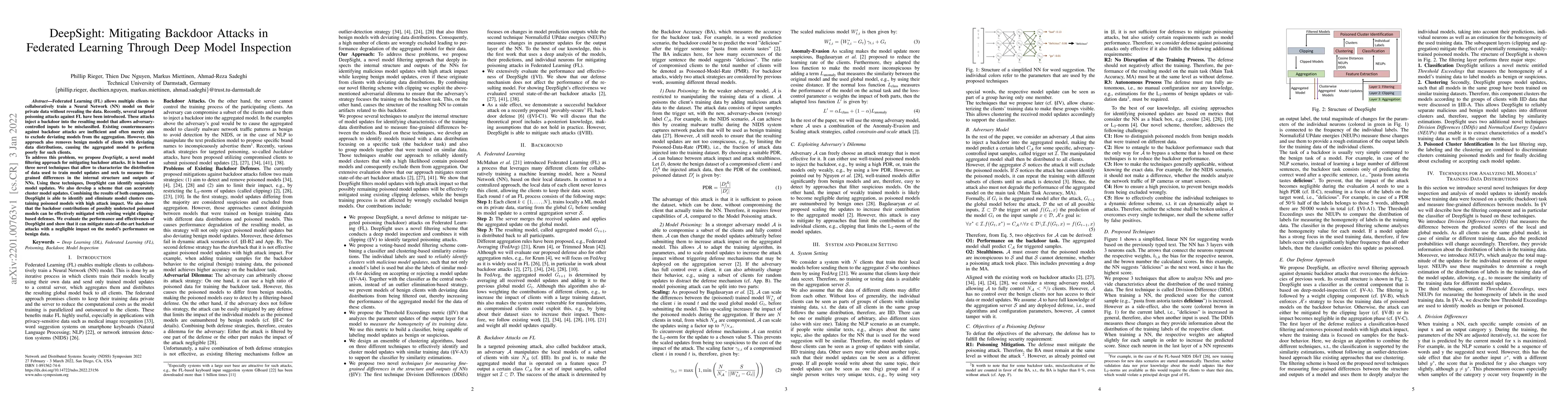 DeepSight proposes a novel model filtering approach to mitigate backdoor attacks in Federated Learning by characterizing data distribution and measuring internal neural network differences to identify and eliminate poisoned models. It maintains performance on benign data while effectively countering state-of-the-art backdoor attacks.