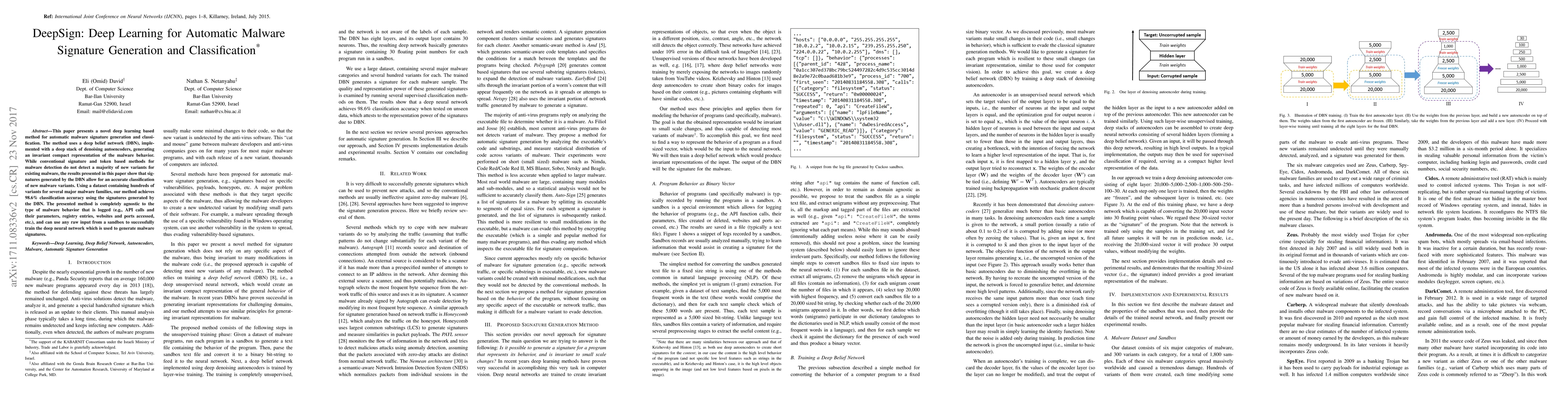 This paper introduces DeepSign, a deep learning method using a deep belief network to automatically generate and classify malware signatures, achieving 98.6% accuracy on a dataset of malware variants. The method is robust and can utilize any raw input data from a sandbox to train the network.