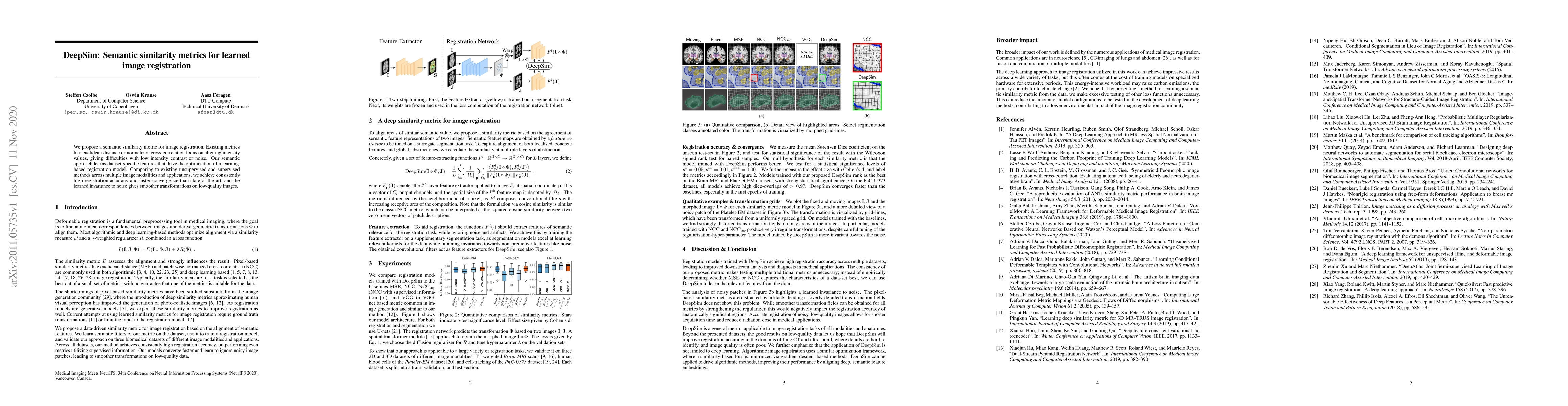 DeepSim introduces a novel semantic similarity metric for image registration that learns dataset-specific features, achieving higher registration accuracy and faster convergence compared to traditional methods, while providing smoother transformations on low-quality images. This approach effectively addresses challenges posed by low intensity contrast and noise.