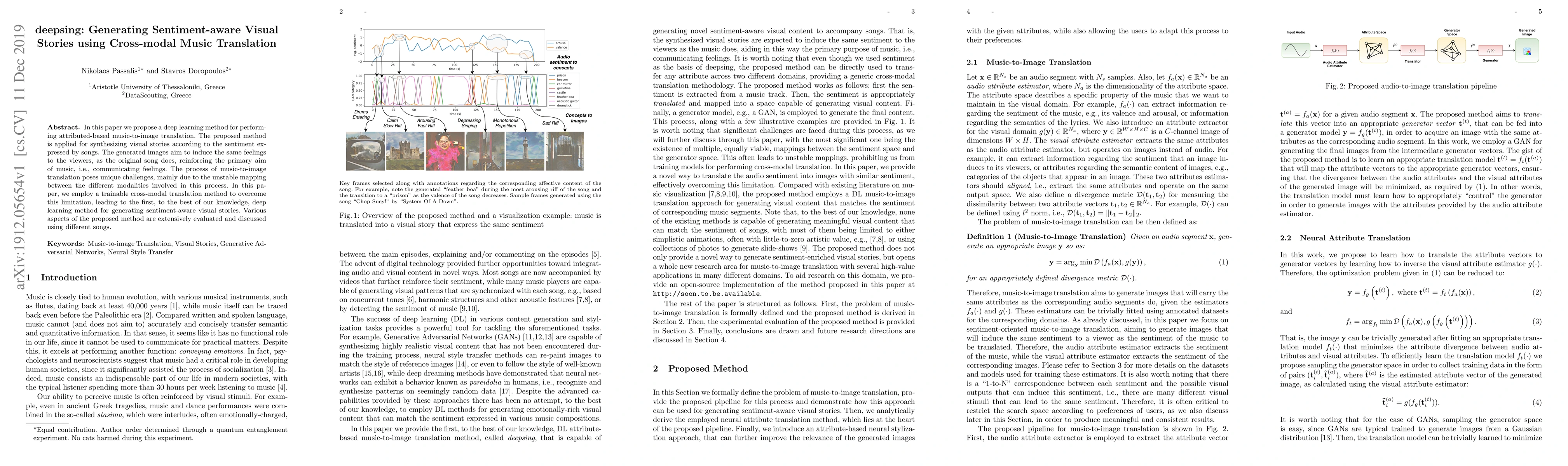 In this paper we propose a deep learning method for performing attributed-based music-to-image translation. The proposed method is applied for synthesizing visual stories according to the sentiment expressed by songs. The generated images aim to induce the same feelings to the viewers, as the original song does, reinforcing the primary aim of music, i.e., communicating feelings. The process of music-to-image translation poses unique challenges, mainly due to the unstable mapping between the different modalities involved in this process. In this paper, we employ a trainable cross-modal translation method to overcome this limitation, leading to the first, to the best of our knowledge, deep learning method for generating sentiment-aware visual stories. Various aspects of the proposed method are extensively evaluated and discussed using different songs.