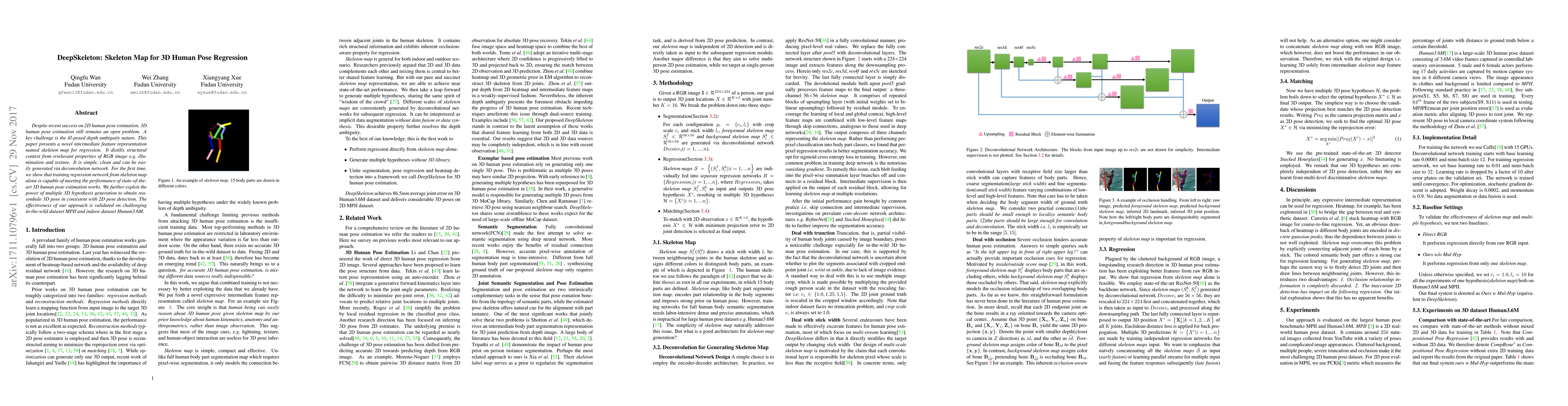 DeepSkeleton introduces a novel skeleton map for 3D human pose regression, distilling structural context from RGB images to overcome depth ambiguity. This method achieves state-of-the-art performance by training a regression network from the skeleton map alone, validated on MPII and Human3.6M datasets.