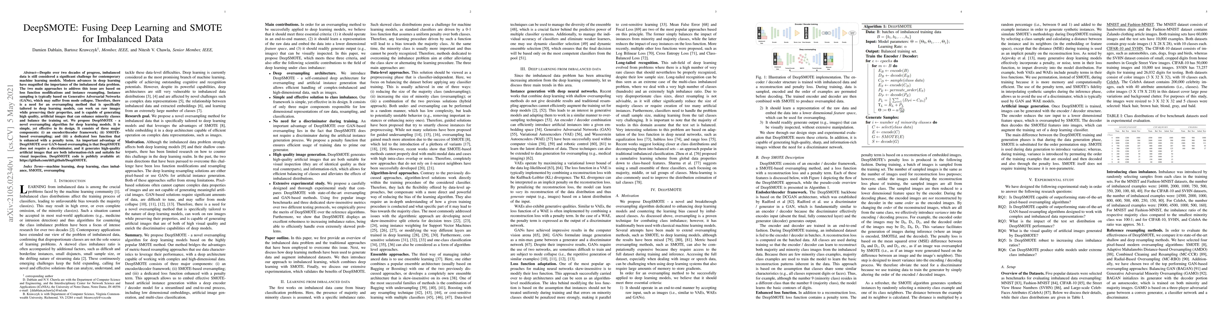 DeepSMOTE fuses deep learning with SMOTE to tackle imbalanced data, offering an oversampling method that generates high-quality, artificial images without a discriminator, enhancing minority classes effectively. The method combines an encoder/decoder framework, SMOTE-based oversampling, and a specialized loss function.