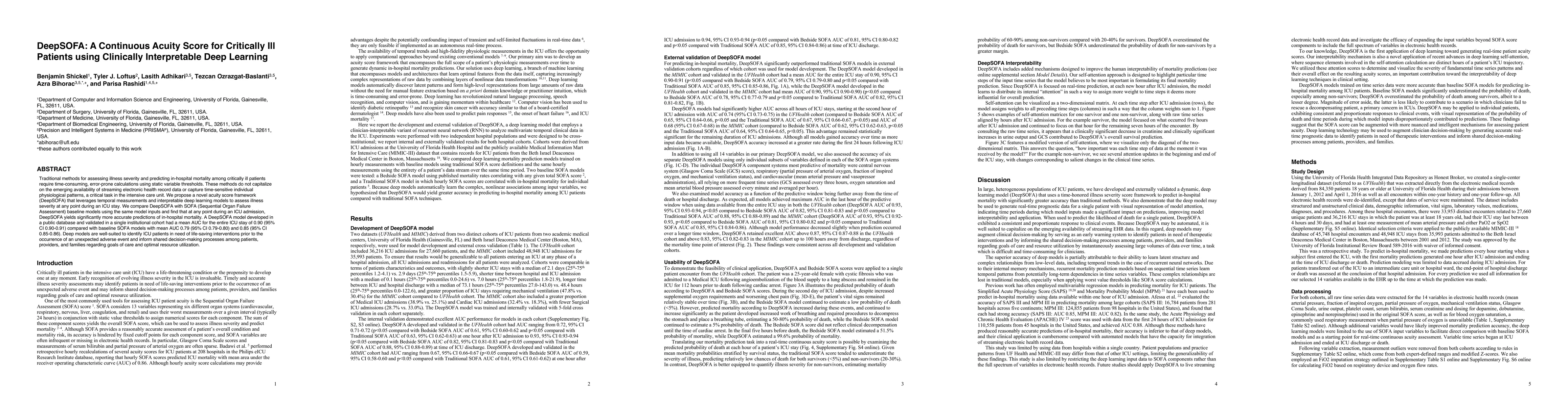 DeepSOFA introduces a continuous acuity score framework using interpretable deep learning to assess illness severity in critically ill patients, significantly improving in-hospital mortality predictions compared to traditional SOFA models. The DeepSOFA model achieved a mean AUC of 0.90, outperforming baseline SOFA models with mean AUCs of 0.79 and 0.85.