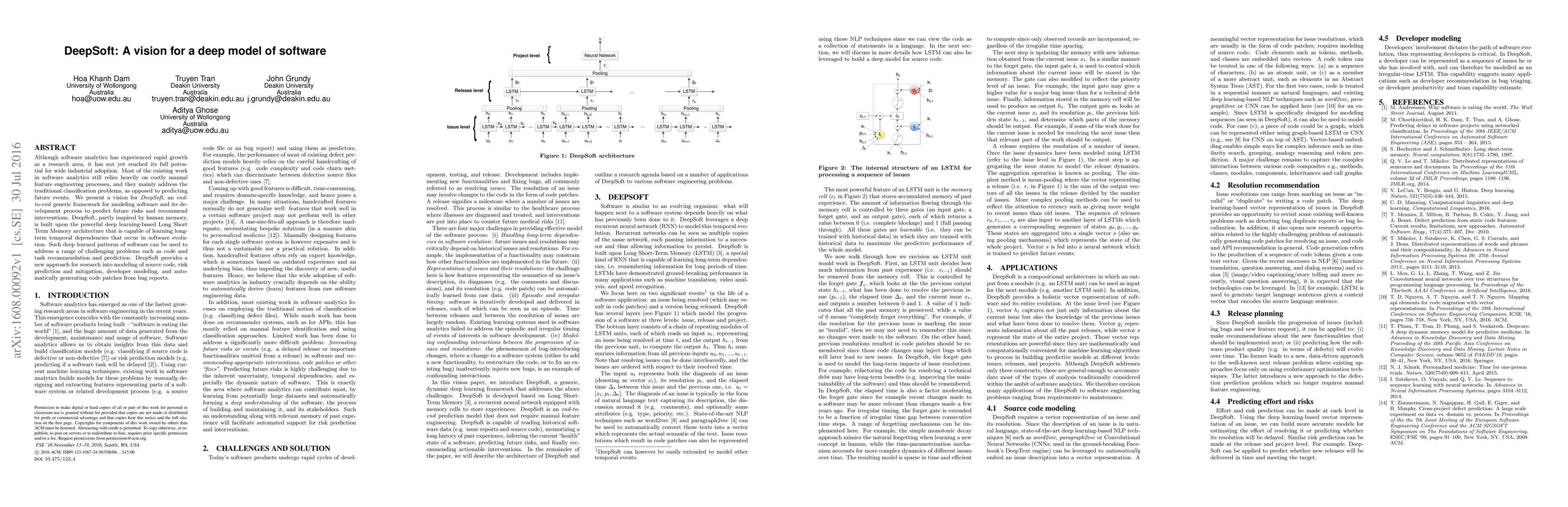 Although software analytics has experienced rapid growth as a research area, it has not yet reached its full potential for wide industrial adoption. Most of the existing work in software analytics still relies heavily on costly manual feature engineering processes, and they mainly address the traditional classification problems, as opposed to predicting future events. We present a vision for \emph{DeepSoft}, an \emph{end-to-end} generic framework for modeling software and its development process to predict future risks and recommend interventions. DeepSoft, partly inspired by human memory, is built upon the powerful deep learning-based Long Short Term Memory architecture that is capable of learning long-term temporal dependencies that occur in software evolution. Such deep learned patterns of software can be used to address a range of challenging problems such as code and task recommendation and prediction. DeepSoft provides a new approach for research into modeling of source code, risk prediction and mitigation, developer modeling, and automatically generating code patches from bug reports.