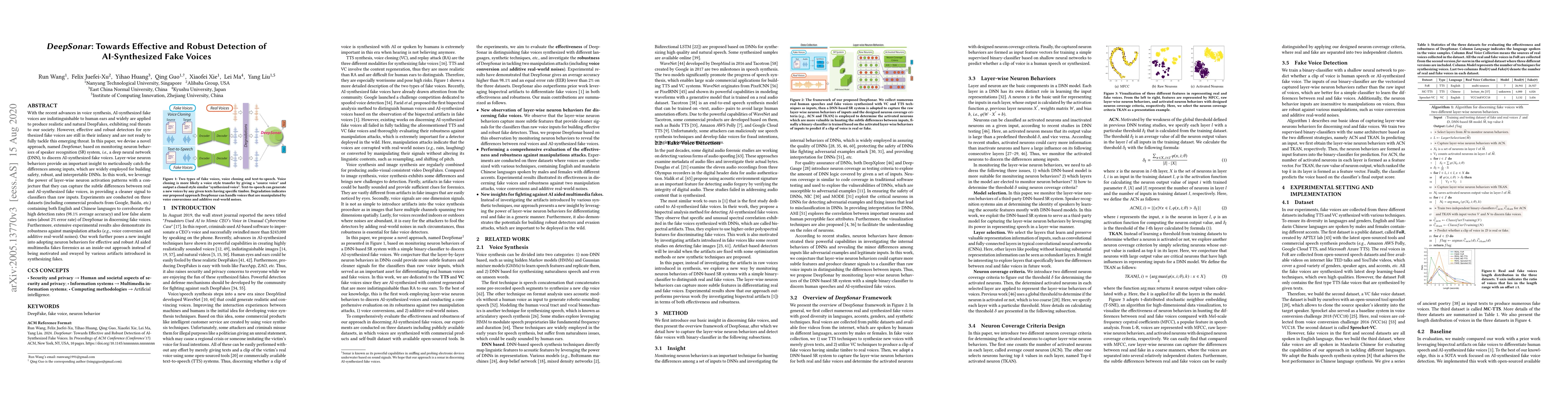 DeepSonar leverages neuron activation patterns in speaker recognition deep neural networks to detect AI-synthesized fake voices, achieving high detection rates and robustness against manipulation attacks. This approach offers a novel inside-out method for multimedia fakes forensics, focusing on intrinsic network behaviors rather than external artifacts.