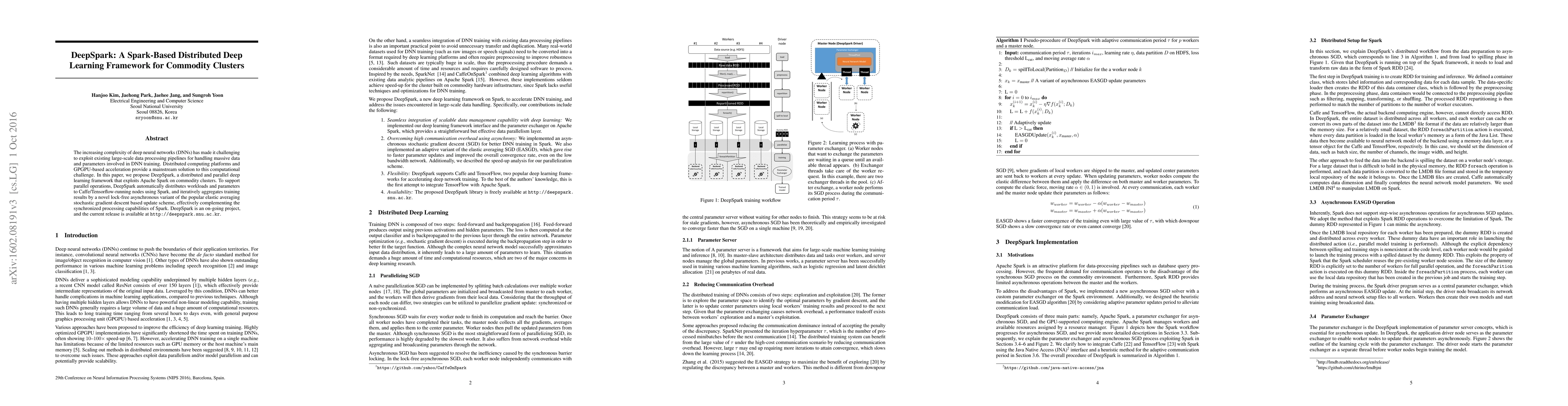 DeepSpark is a distributed deep learning framework that leverages Apache Spark on commodity clusters to efficiently train complex neural networks. It offers improved scalability and flexibility by automatically distributing workloads and aggregating training results in an asynchronous manner.