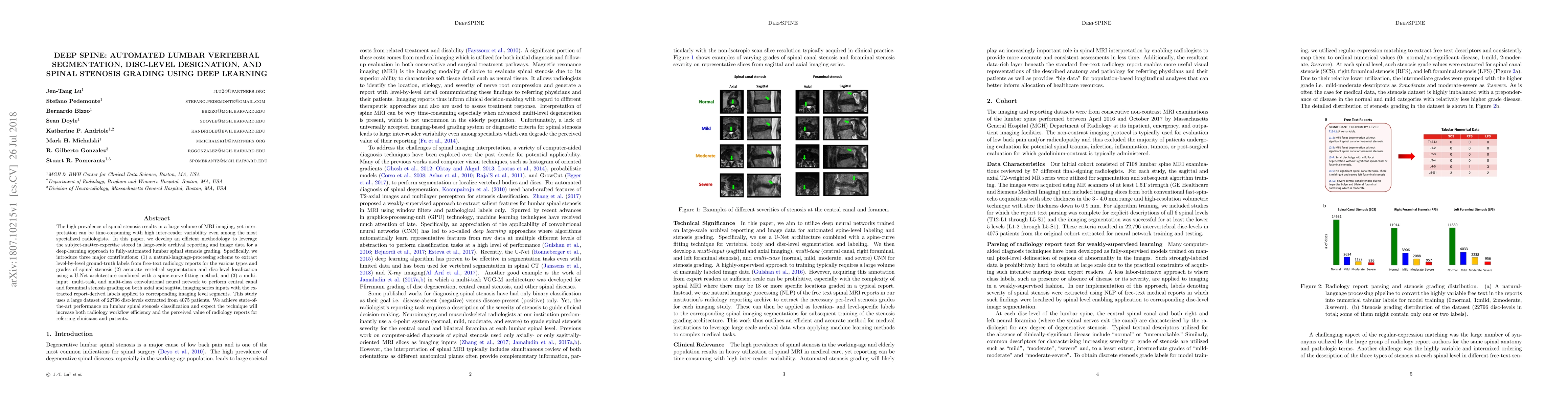 DeepSPINE automates lumbar vertebral segmentation, disc-level designation, and spinal stenosis grading using deep learning, leveraging natural-language processing and a multi-task convolutional neural network to enhance radiology workflow efficiency. The method achieves state-of-the-art performance on lumbar spinal stenosis classification.