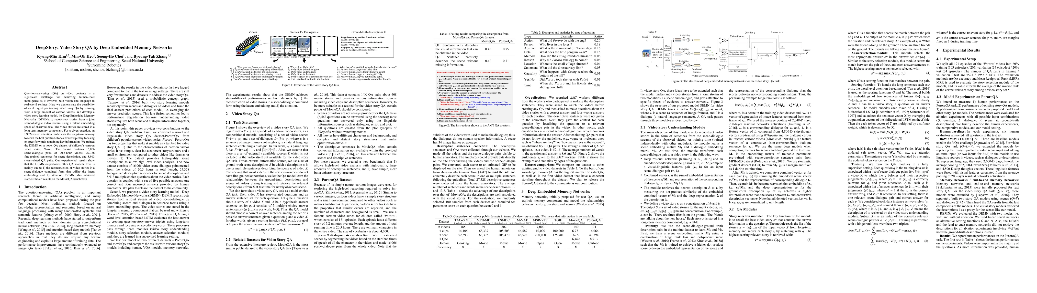 Question-answering (QA) on video contents is a significant challenge for achieving human-level intelligence as it involves both vision and language in real-world settings. Here we demonstrate the possibility of an AI agent performing video story QA by learning from a large amount of cartoon videos. We develop a video-story learning model, i.e. Deep Embedded Memory Networks (DEMN), to reconstruct stories from a joint scene-dialogue video stream using a latent embedding space of observed data. The video stories are stored in a long-term memory component. For a given question, an LSTM-based attention model uses the long-term memory to recall the best question-story-answer triplet by focusing on specific words containing key information. We trained the DEMN on a novel QA dataset of children's cartoon video series, Pororo. The dataset contains 16,066 scene-dialogue pairs of 20.5-hour videos, 27,328 fine-grained sentences for scene description, and 8,913 story-related QA pairs. Our experimental results show that the DEMN outperforms other QA models. This is mainly due to 1) the reconstruction of video stories in a scene-dialogue combined form that utilize the latent embedding and 2) attention. DEMN also achieved state-of-the-art results on the MovieQA benchmark.