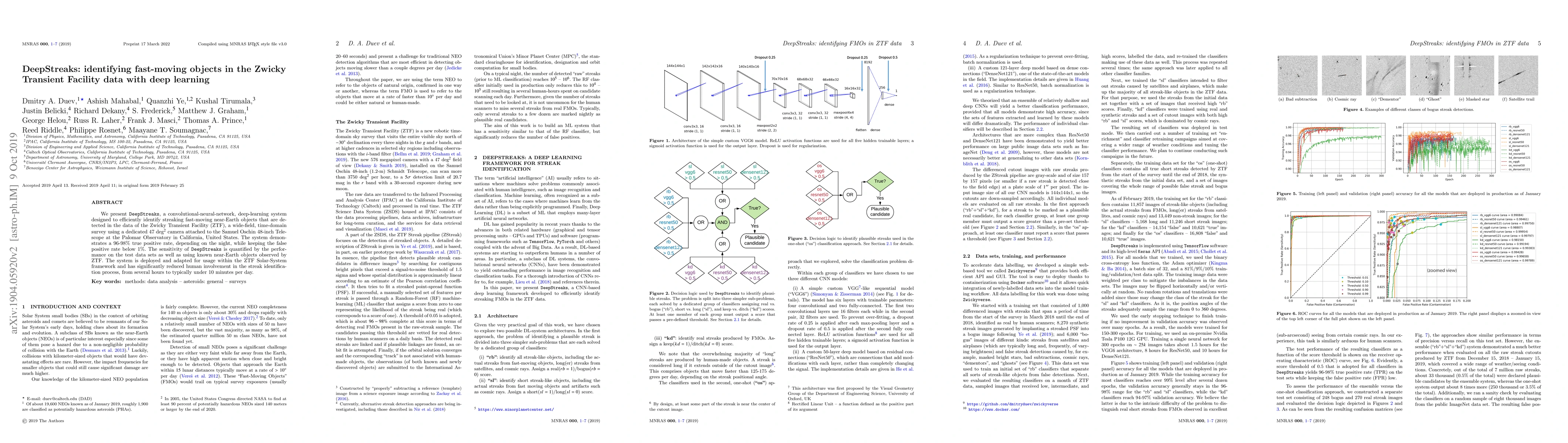 DeepStreaks is a deep-learning system using convolutional neural networks to identify fast-moving near-Earth objects in the Zwicky Transient Facility data, achieving a high true positive rate and low false positive rate. It has drastically reduced human effort in the identification process.