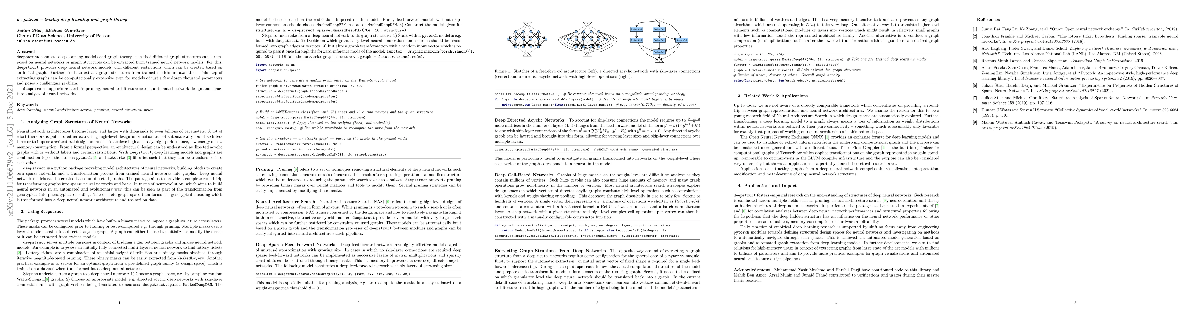 Summary: Deepstruct integrates deep learning with graph theory to impose graph structures on neural networks or extract them from trained models, facilitating research in pruning, neural architecture search, and automated network design. It addresses the computational challenge of extracting graph structures from large neural networks.
