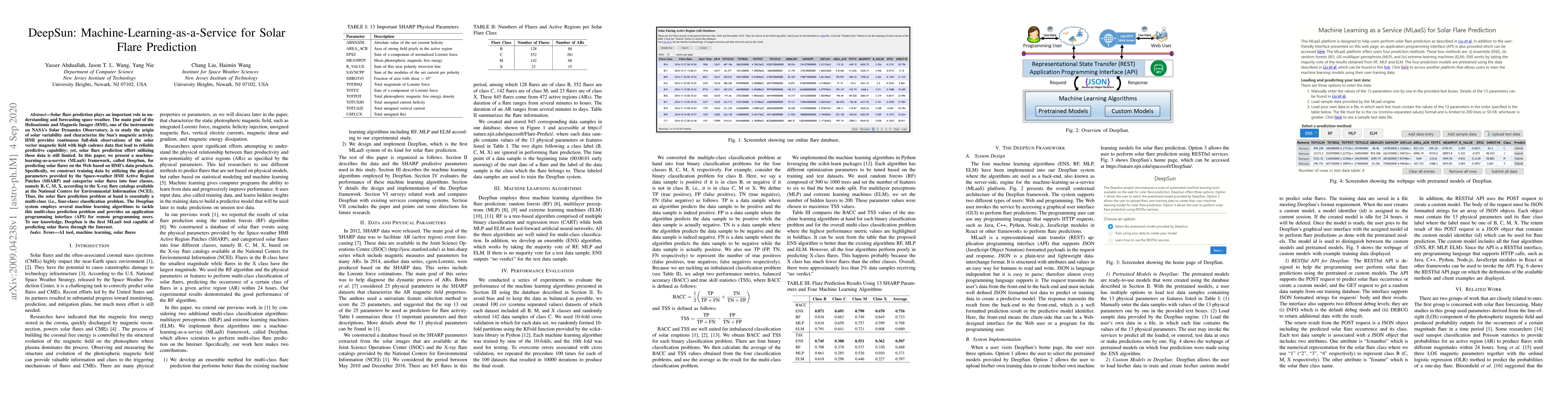 DeepSun is a machine-learning-as-a-service (MLaaS) framework for predicting solar flares using data from NASA's Solar Dynamics Observatory's Helioseismic and Magnetic Imager (HMI). It categorizes flares into four classes (B, C, M, X) and provides an API for remote users.