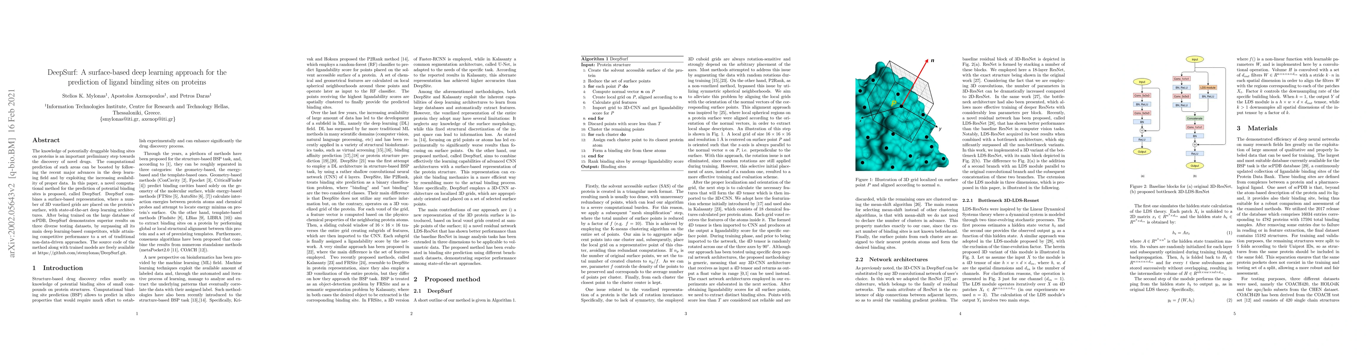 DeepSurf is a novel deep learning method that uses surface-based representations and 3D voxel grids to predict potential ligand binding sites on proteins, outperforming existing deep learning models and matching traditional methods in accuracy. Trained on scPDB data, it shows superior performance on multiple testing datasets.