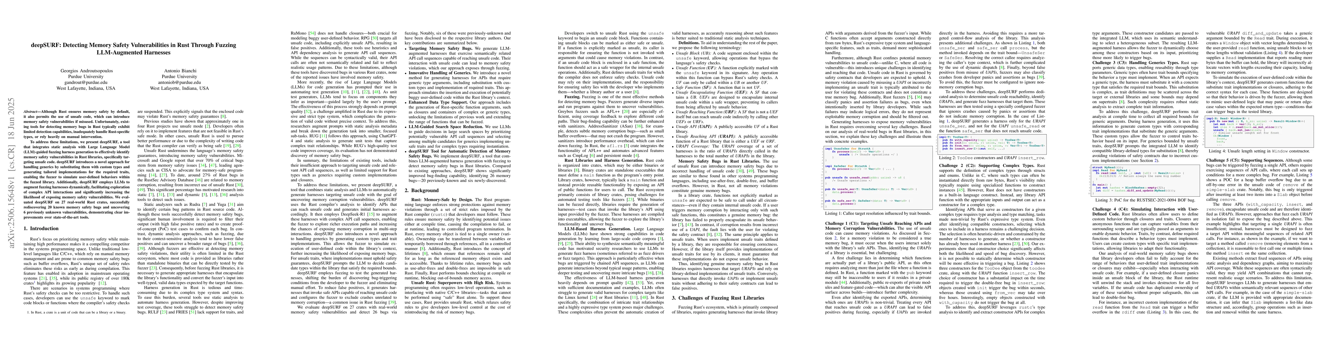Although Rust ensures memory safety by default, it also permits the use of unsafe code, which can introduce memory safety vulnerabilities if misused. Unfortunately, existing tools for detecting memory bugs in Rust typically exhibit limited detection capabilities, inadequately handle Rust-specific types, or rely heavily on manual intervention. To address these limitations, we present deepSURF, a tool that integrates static analysis with Large Language Model (LLM)-guided fuzzing harness generation to effectively identify memory safety vulnerabilities in Rust libraries, specifically targeting unsafe code. deepSURF introduces a novel approach for handling generics by substituting them with custom types and generating tailored implementations for the required traits, enabling the fuzzer to simulate user-defined behaviors within the fuzzed library. Additionally, deepSURF employs LLMs to augment fuzzing harnesses dynamically, facilitating exploration of complex API interactions and significantly increasing the likelihood of exposing memory safety vulnerabilities. We evaluated deepSURF on 27 real-world Rust crates, successfully rediscovering 20 known memory safety bugs and uncovering 6 previously unknown vulnerabilities, demonstrating clear improvements over state-of-the-art tools.