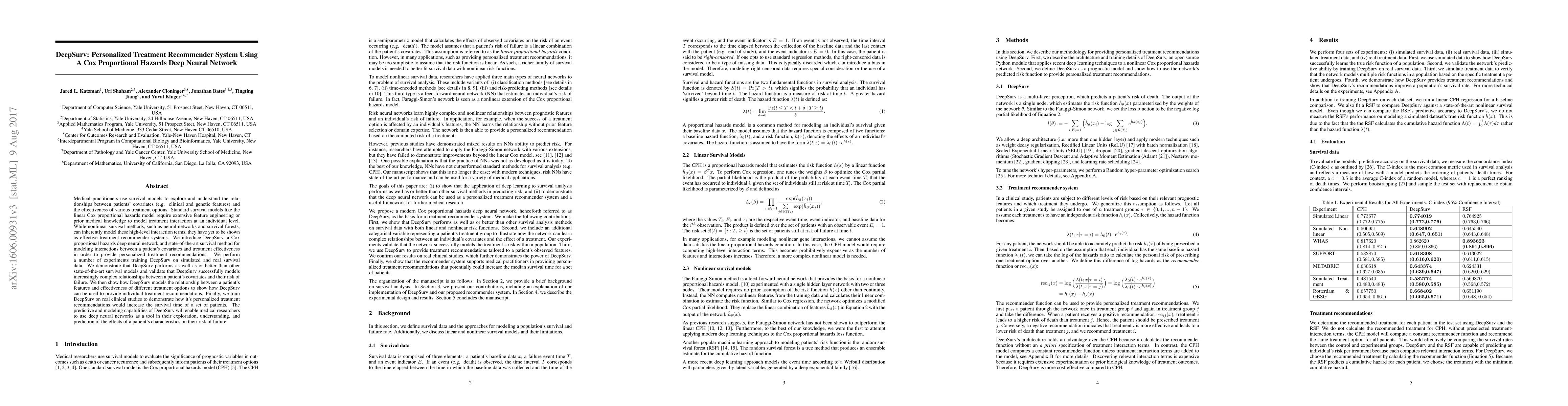 DeepSurv is a Cox proportional hazards deep neural network designed to model interactions between patient covariates and treatment effectiveness, providing personalized treatment recommendations. Experiments show DeepSurv performs as well as or better than other survival models, successfully modeling complex relationships, and improving patient survival times in clinical studies.
