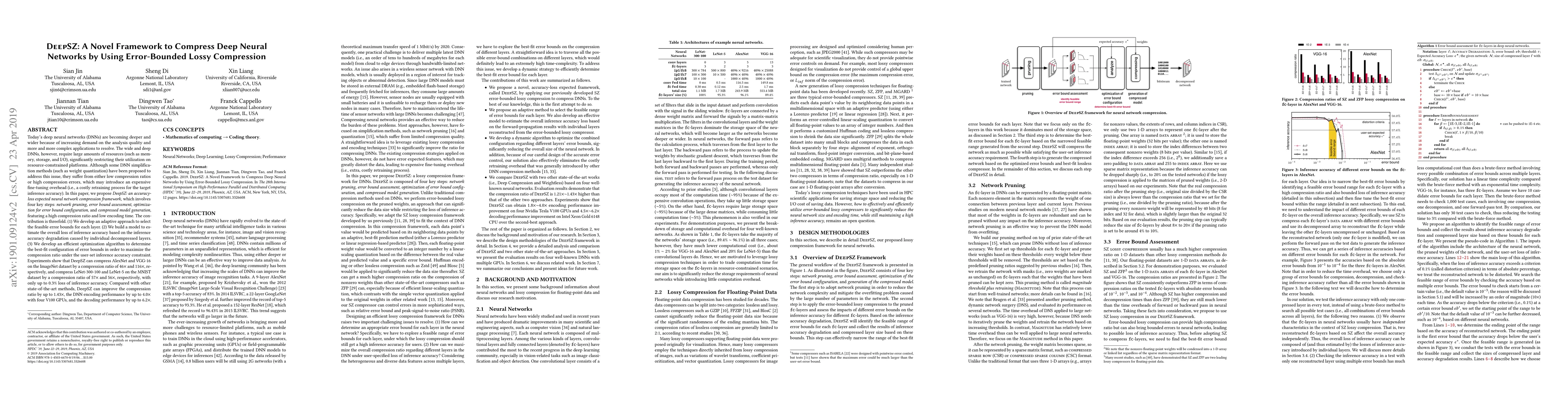 DeepSZ proposes a novel framework for compressing deep neural networks through error-bounded lossy compression, achieving high compression ratios and minimal accuracy loss. The method involves adaptive error bound selection, accuracy loss estimation, and optimization for the best error bound configuration.