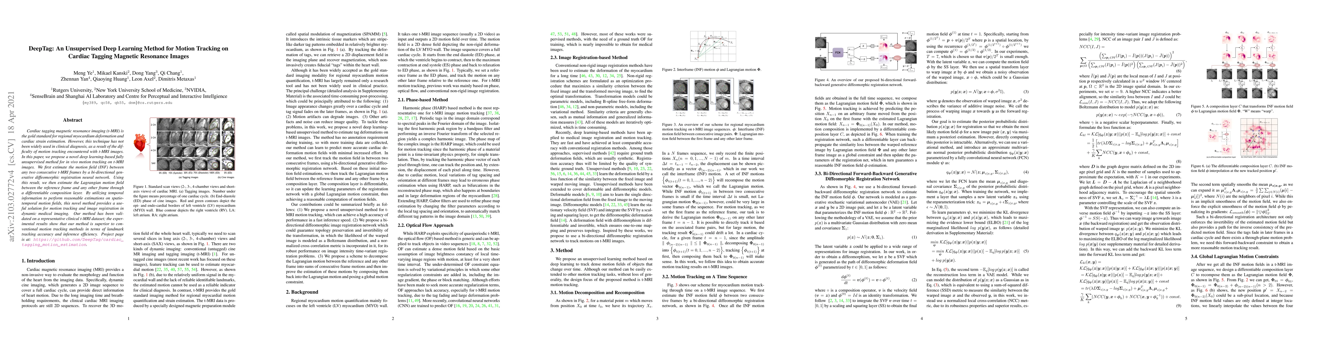 This paper proposes DeepTag, an unsupervised deep learning method for motion tracking in cardiac tagging magnetic resonance images (t-MRI). The method estimates the motion field using a bi-directional generative diffeomorphic registration neural network, followed by a differentiable composition layer for Lagrangian motion field estimation, demonstrating superior accuracy and efficiency compared to conventional methods.