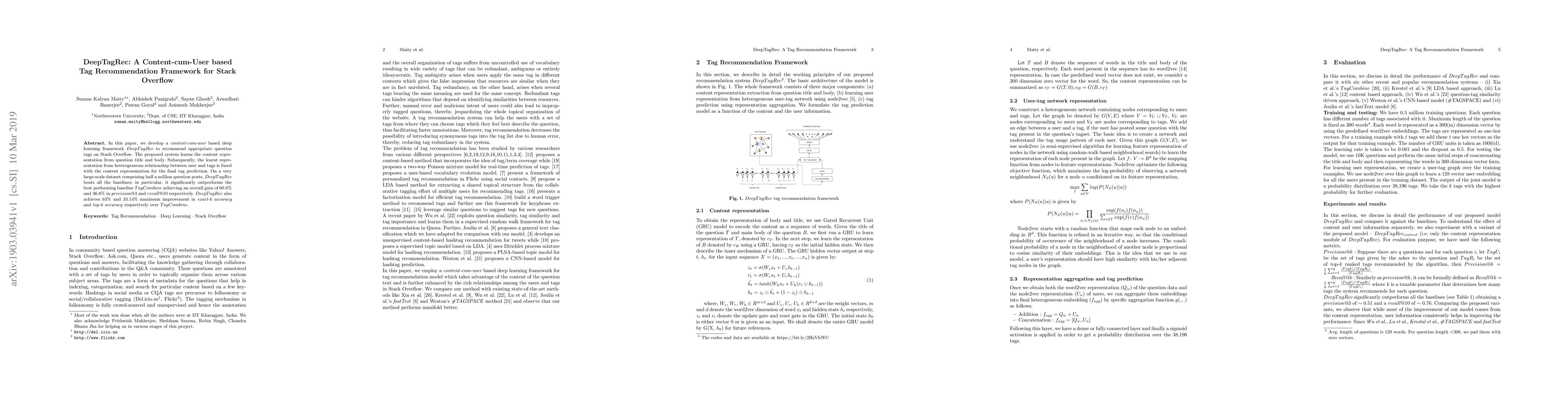 In this paper, we develop a content-cum-user based deep learning framework DeepTagRec to recommend appropriate question tags on Stack Overflow. The proposed system learns the content representation from question title and body. Subsequently, the learnt representation from heterogeneous relationship between user and tags is fused with the content representation for the final tag prediction. On a very large-scale dataset comprising half a million question posts, DeepTagRec beats all the baselines; in particular, it significantly outperforms the best performing baseline T agCombine achieving an overall gain of 60.8% and 36.8% in precision@3 and recall@10 respectively. DeepTagRec also achieves 63% and 33.14% maximum improvement in exact-k accuracy and top-k accuracy respectively over TagCombine