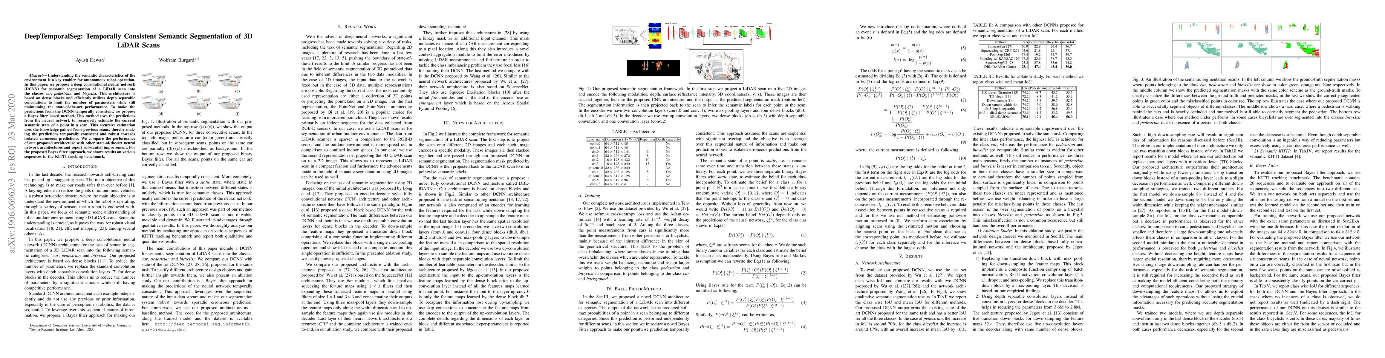DeepTemporalSeg introduces a deep convolutional neural network for temporally consistent semantic segmentation of 3D LiDAR scans, achieving state-of-the-art performance through efficient depth separable convolutions. It employs a Bayes filter to ensure temporal consistency, leveraging previous scans to correct isolated errors and improve robustness.