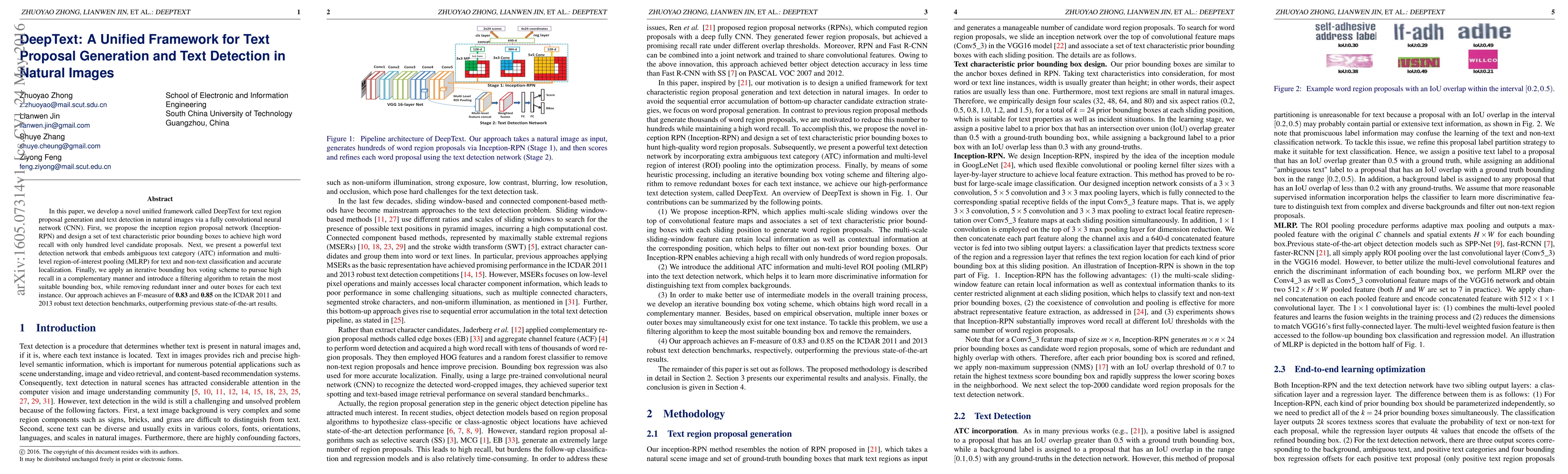 In this paper, we develop a novel unified framework called DeepText for text region proposal generation and text detection in natural images via a fully convolutional neural network (CNN). First, we propose the inception region proposal network (Inception-RPN) and design a set of text characteristic prior bounding boxes to achieve high word recall with only hundred level candidate proposals. Next, we present a powerful textdetection network that embeds ambiguous text category (ATC) information and multilevel region-of-interest pooling (MLRP) for text and non-text classification and accurate localization. Finally, we apply an iterative bounding box voting scheme to pursue high recall in a complementary manner and introduce a filtering algorithm to retain the most suitable bounding box, while removing redundant inner and outer boxes for each text instance. Our approach achieves an F-measure of 0.83 and 0.85 on the ICDAR 2011 and 2013 robust text detection benchmarks, outperforming previous state-of-the-art results.