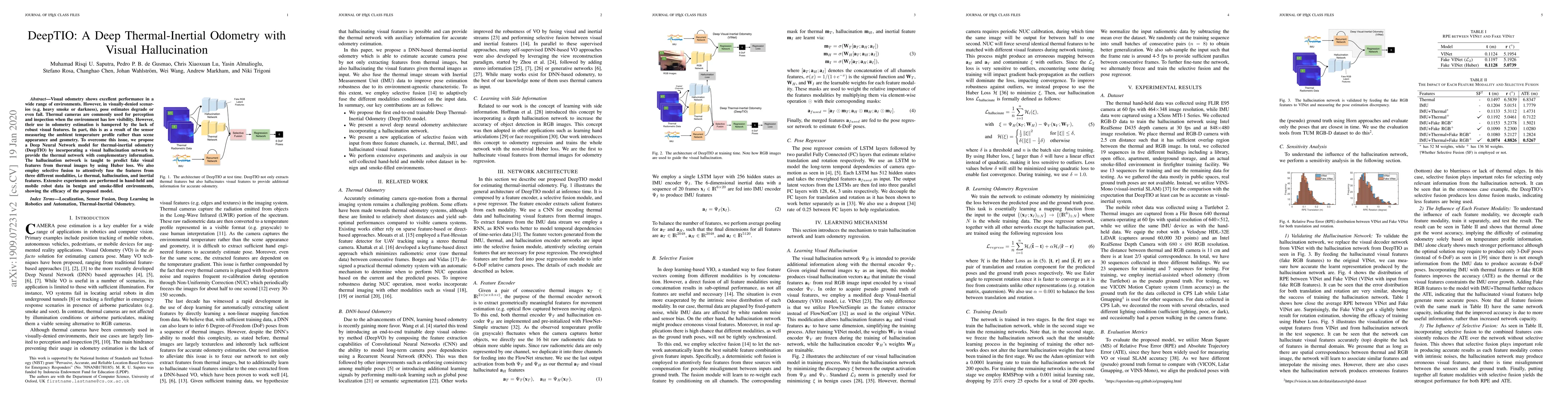 DeepTIO integrates a deep neural network with a visual hallucination module to enhance thermal-inertial odometry in low-visibility environments. The hallucination network generates synthetic visual features from thermal images, while selective fusion combines thermal, hallucination, and inertial features for robust pose estimation.