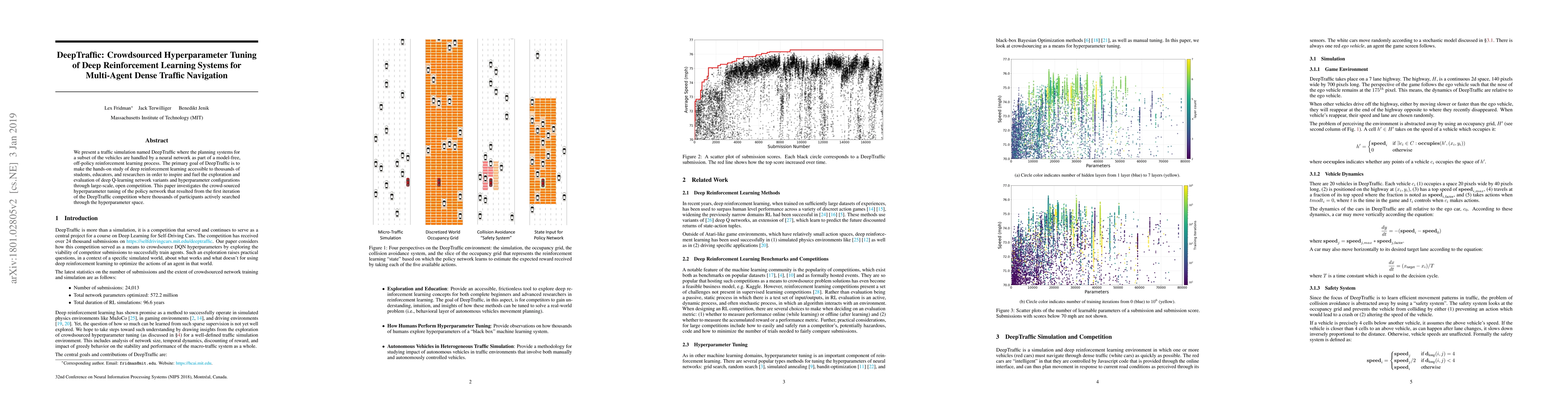 DeepTraffic is a traffic simulation using neural networks for model-free, off-policy reinforcement learning, aiming to democratize deep reinforcement learning study. The paper analyzes crowd-sourced hyperparameter tuning results from the first DeepTraffic competition involving thousands of participants.