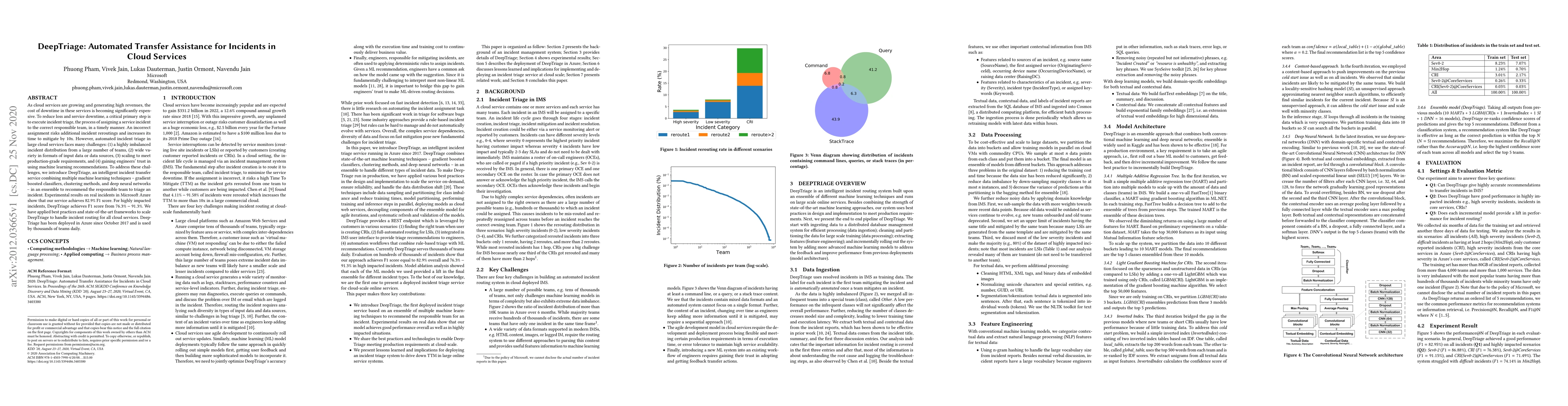 DeepTriage automates incident triage in cloud services by using an ensemble of machine learning techniques to assign incidents to the correct teams, significantly reducing downtime and costs. Deployed in Microsoft Azure since 2017, it achieves an 82.9% F1 score and has scaled to meet production-grade requirements.