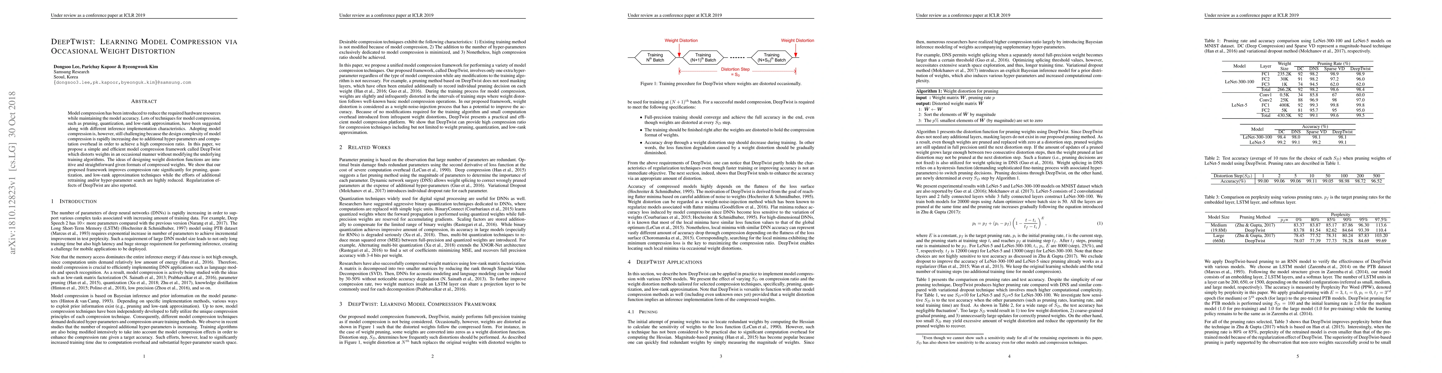 Model compression has been introduced to reduce the required hardware resources while maintaining the model accuracy. Lots of techniques for model compression, such as pruning, quantization, and low-rank approximation, have been suggested along with different inference implementation characteristics. Adopting model compression is, however, still challenging because the design complexity of model compression is rapidly increasing due to additional hyper-parameters and computation overhead in order to achieve a high compression ratio. In this paper, we propose a simple and efficient model compression framework called DeepTwist which distorts weights in an occasional manner without modifying the underlying training algorithms. The ideas of designing weight distortion functions are intuitive and straightforward given formats of compressed weights. We show that our proposed framework improves compression rate significantly for pruning, quantization, and low-rank approximation techniques while the efforts of additional retraining and/or hyper-parameter search are highly reduced. Regularization effects of DeepTwist are also reported.