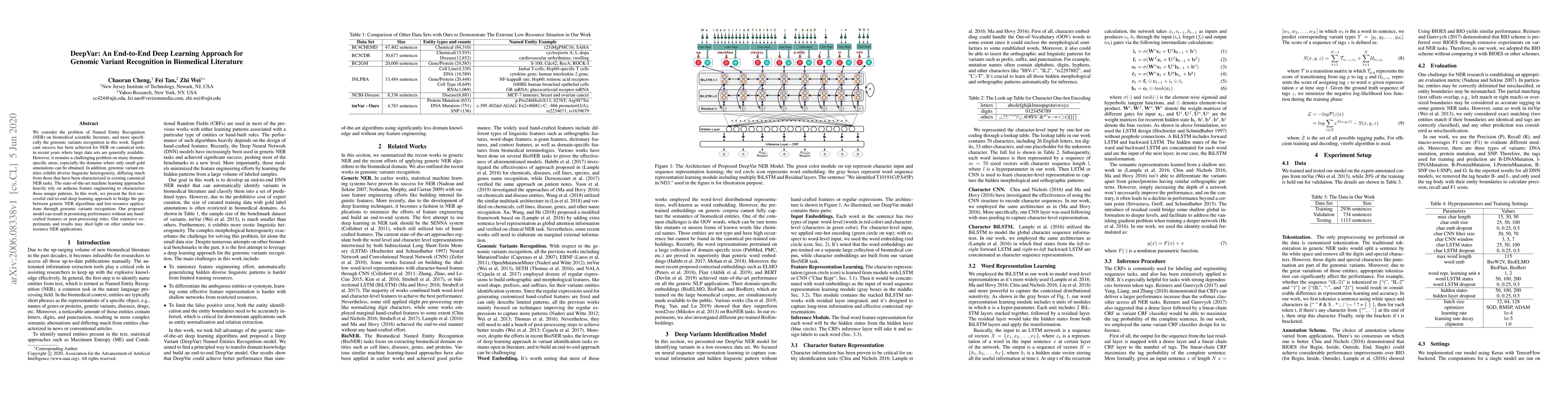 DeepVar introduces an end-to-end deep learning approach for genomic variant recognition in biomedical literature, addressing the challenges of low-resource domain-specific Named Entity Recognition. The model achieves promising results without relying on hand-crafted features, offering a potential solution for similar low-resource NER tasks.