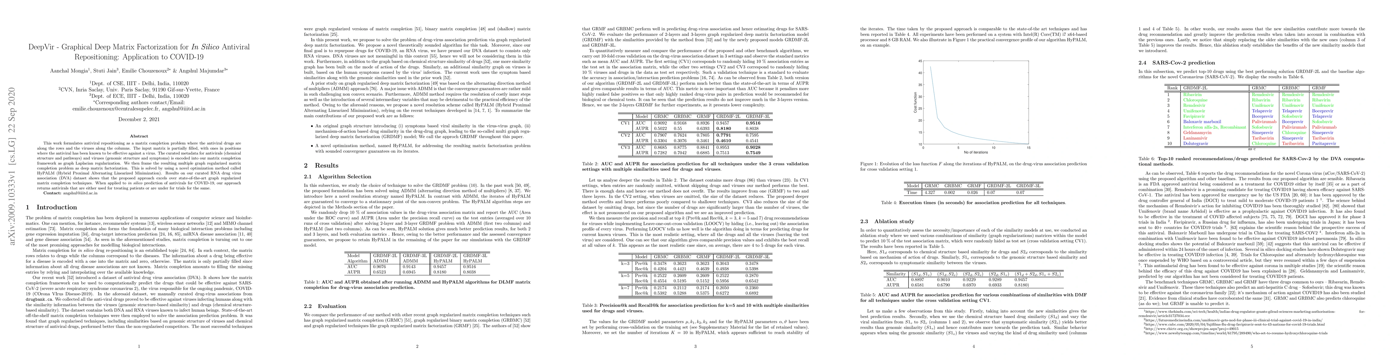 This work formulates antiviral repositioning as a matrix completion problem where the antiviral drugs are along the rows and the viruses along the columns. The input matrix is partially filled, with ones in positions where the antiviral has been known to be effective against a virus. The curated metadata for antivirals (chemical structure and pathways) and viruses (genomic structure and symptoms) is encoded into our matrix completion framework as graph Laplacian regularization. We then frame the resulting multiple graph regularized matrix completion problem as deep matrix factorization. This is solved by using a novel optimization method called HyPALM (Hybrid Proximal Alternating Linearized Minimization). Results on our curated RNA drug virus association (DVA) dataset shows that the proposed approach excels over state-of-the-art graph regularized matrix completion techniques. When applied to "in silico" prediction of antivirals for COVID-19, our approach returns antivirals that are either used for treating patients or are under for trials for the same.