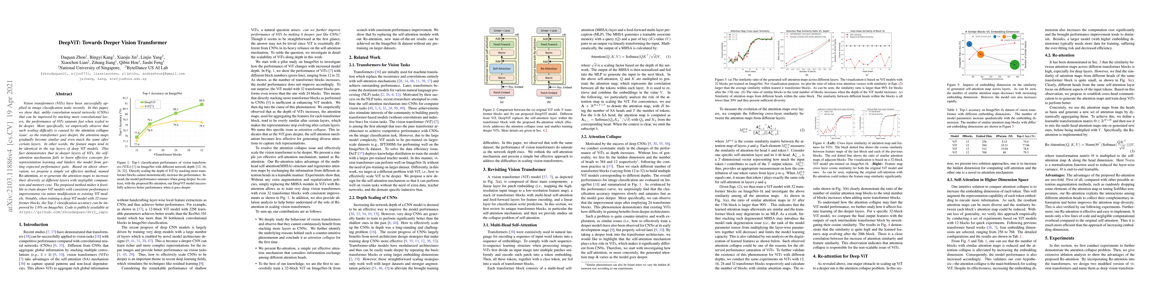 This paper addresses the scaling difficulty of Vision Transformers (ViTs) by introducing the Re-attention method to mitigate attention collapse in deeper layers, enabling consistent performance improvements. The proposed approach enhances the diversity of attention maps with minimal computational overhead, achieving a 1.6% accuracy boost on ImageNet with a 32-block ViT model.