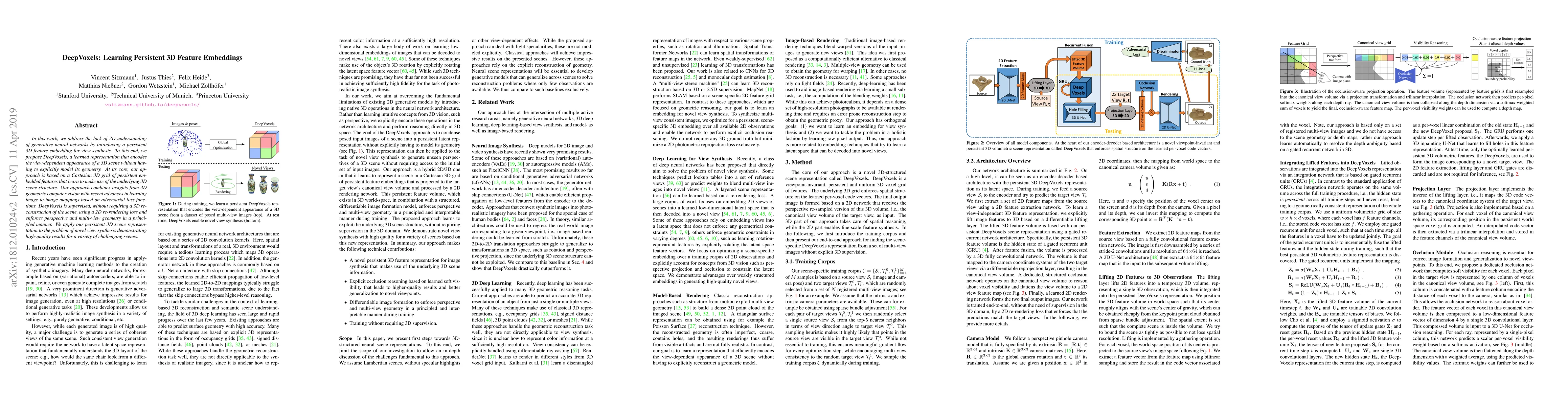 Researchers introduced DeepVoxels, a method for learning persistent 3D feature embeddings to improve view synthesis in generative neural networks. The approach enables high-quality novel views without requiring explicit 3D geometry modeling.