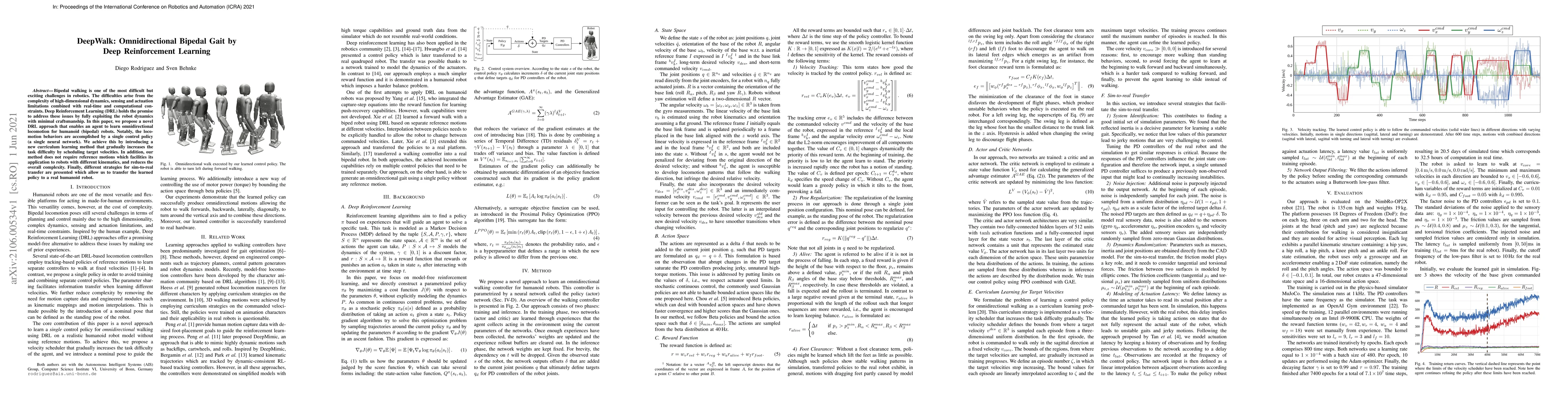 This paper proposes a Deep Reinforcement Learning approach to enable omnidirectional bipedal walking for humanoid robots using a single neural network policy. It introduces a curriculum learning method to gradually increase task difficulty and presents strategies for sim-to-real transfer, facilitating application to robots with varying kinematics.