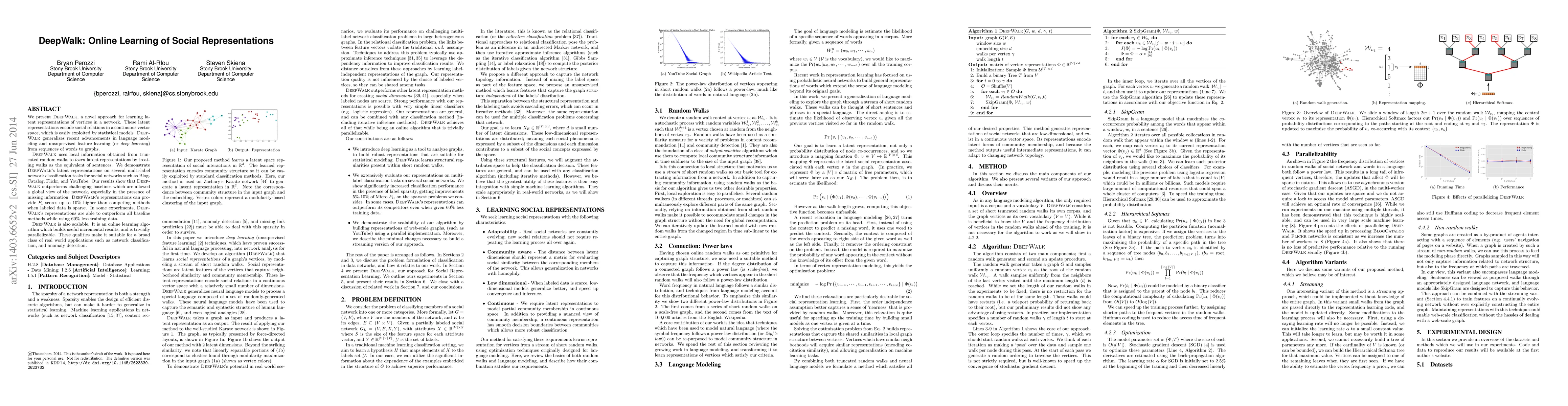 We present DeepWalk, a novel approach for learning latent representations of vertices in a network. These latent representations encode social relations in a continuous vector space, which is easily exploited by statistical models. DeepWalk generalizes recent advancements in language modeling and unsupervised feature learning (or deep learning) from sequences of words to graphs. DeepWalk uses local information obtained from truncated random walks to learn latent representations by treating walks as the equivalent of sentences. We demonstrate DeepWalk's latent representations on several multi-label network classification tasks for social networks such as BlogCatalog, Flickr, and YouTube. Our results show that DeepWalk outperforms challenging baselines which are allowed a global view of the network, especially in the presence of missing information. DeepWalk's representations can provide $F_1$ scores up to 10% higher than competing methods when labeled data is sparse. In some experiments, DeepWalk's representations are able to outperform all baseline methods while using 60% less training data. DeepWalk is also scalable. It is an online learning algorithm which builds useful incremental results, and is trivially parallelizable. These qualities make it suitable for a broad class of real world applications such as network classification, and anomaly detection.