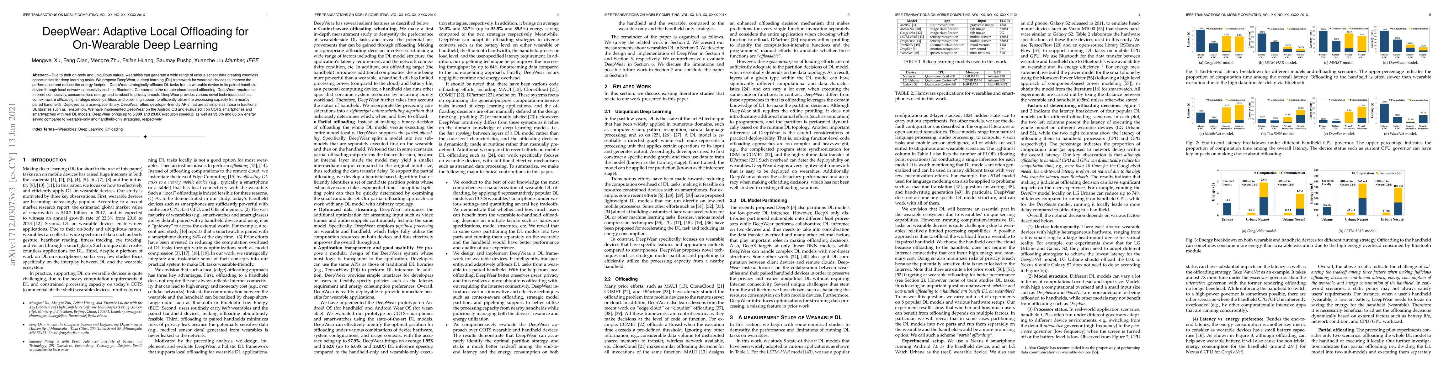 Due to their on-body and ubiquitous nature, wearables can generate a wide range of unique sensor data creating countless opportunities for deep learning tasks. We propose DeepWear, a deep learning (DL) framework for wearable devices to improve the performance and reduce the energy footprint. DeepWear strategically offloads DL tasks from a wearable device to its paired handheld device through local network. Compared to the remote-cloud-based offloading, DeepWear requires no Internet connectivity, consumes less energy, and is robust to privacy breach. DeepWear provides various novel techniques such as context-aware offloading, strategic model partition, and pipelining support to efficiently utilize the processing capacity from nearby paired handhelds. Deployed as a user-space library, DeepWear offers developer-friendly APIs that are as simple as those in traditional DL libraries such as TensorFlow. We have implemented DeepWear on the Android OS and evaluated it on COTS smartphones and smartwatches with real DL models. DeepWear brings up to 5.08X and 23.0X execution speedup, as well as 53.5% and 85.5% energy saving compared to wearable-only and handheld-only strategies, respectively.