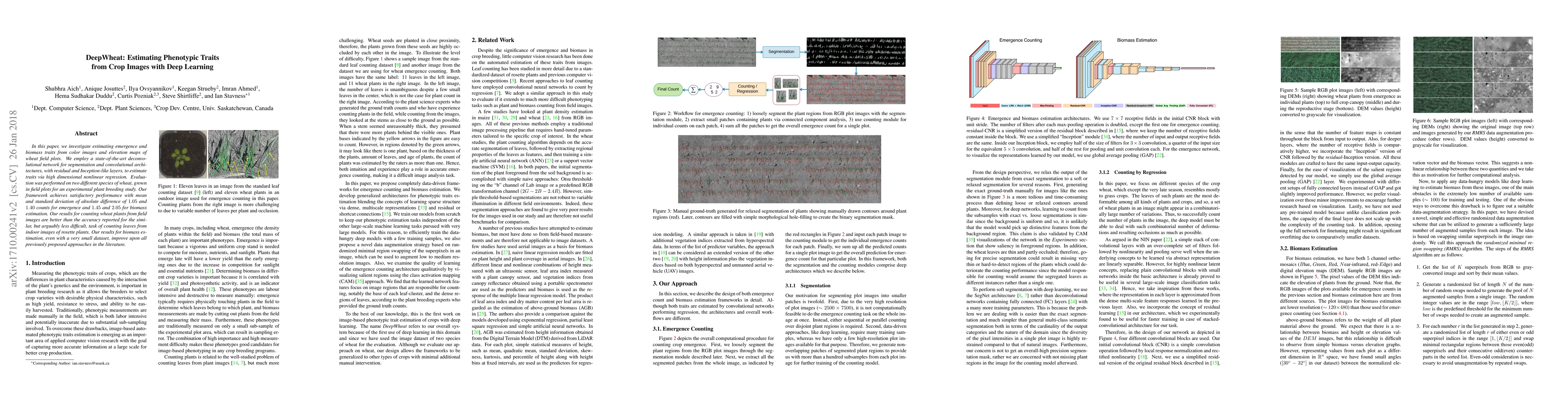 In this paper, we investigate estimating emergence and biomass traits from color images and elevation maps of wheat field plots. We employ a state-of-the-art deconvolutional network for segmentation and convolutional architectures, with residual and Inception-like layers, to estimate traits via high dimensional nonlinear regression. Evaluation was performed on two different species of wheat, grown in field plots for an experimental plant breeding study. Our framework achieves satisfactory performance with mean and standard deviation of absolute difference of 1.05 and 1.40 counts for emergence and 1.45 and 2.05 for biomass estimation. Our results for counting wheat plants from field images are better than the accuracy reported for the similar, but arguably less difficult, task of counting leaves from indoor images of rosette plants. Our results for biomass estimation, even with a very small dataset, improve upon all previously proposed approaches in the literature.