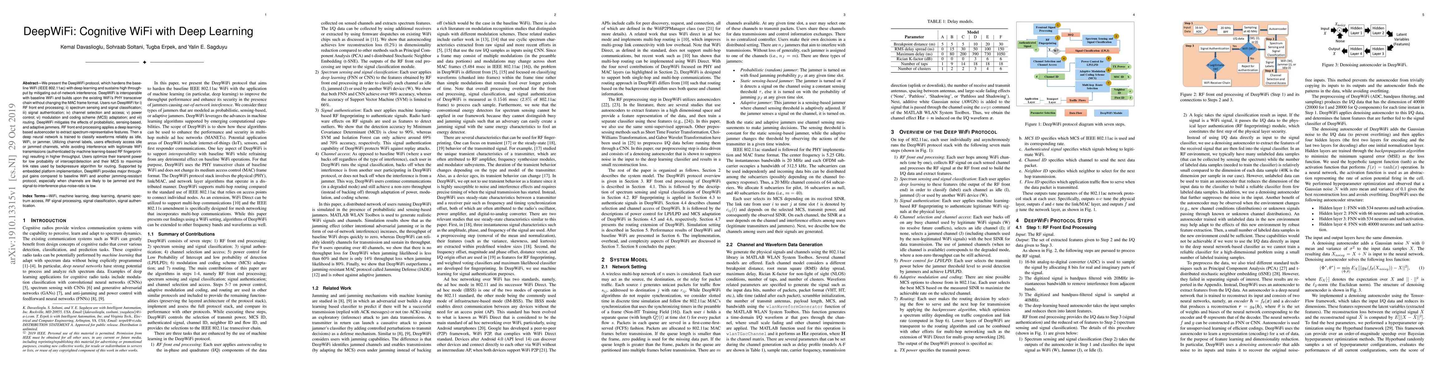 We present the DeepWiFi protocol, which hardens the baseline WiFi (IEEE 802.11ac) with deep learning and sustains high throughput by mitigating out-of-network interference. DeepWiFi is interoperable with baseline WiFi and builds upon the existing WiFi's PHY transceiver chain without changing the MAC frame format. Users run DeepWiFi for i) RF front end processing; ii) spectrum sensing and signal classification; iii) signal authentication; iv) channel selection and access; v) power control; vi) modulation and coding scheme (MCS) adaptation; and vii) routing. DeepWiFi mitigates the effects of probabilistic, sensing-based, and adaptive jammers. RF front end processing applies a deep learning-based autoencoder to extract spectrum-representative features. Then a deep neural network is trained to classify waveforms reliably as idle, WiFi, or jammer. Utilizing channel labels, users effectively access idle or jammed channels, while avoiding interference with legitimate WiFi transmissions (authenticated by machine learning-based RF fingerprinting) resulting in higher throughput. Users optimize their transmit power for low probability of intercept/detection and their MCS to maximize link rates used by backpressure algorithm for routing. Supported by embedded platform implementation, DeepWiFi provides major throughput gains compared to baseline WiFi and another jamming-resistant protocol, especially when channels are likely to be jammed and the signal-to-interference-plus-noise-ratio is low.